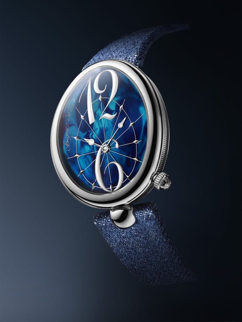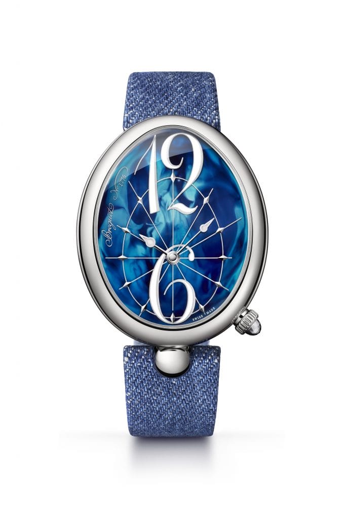 Cadran aux volutes bleues et bracelet de tissu indigo, la Reine de Naples 8967 de Breguet s’habille de teintes célestes.