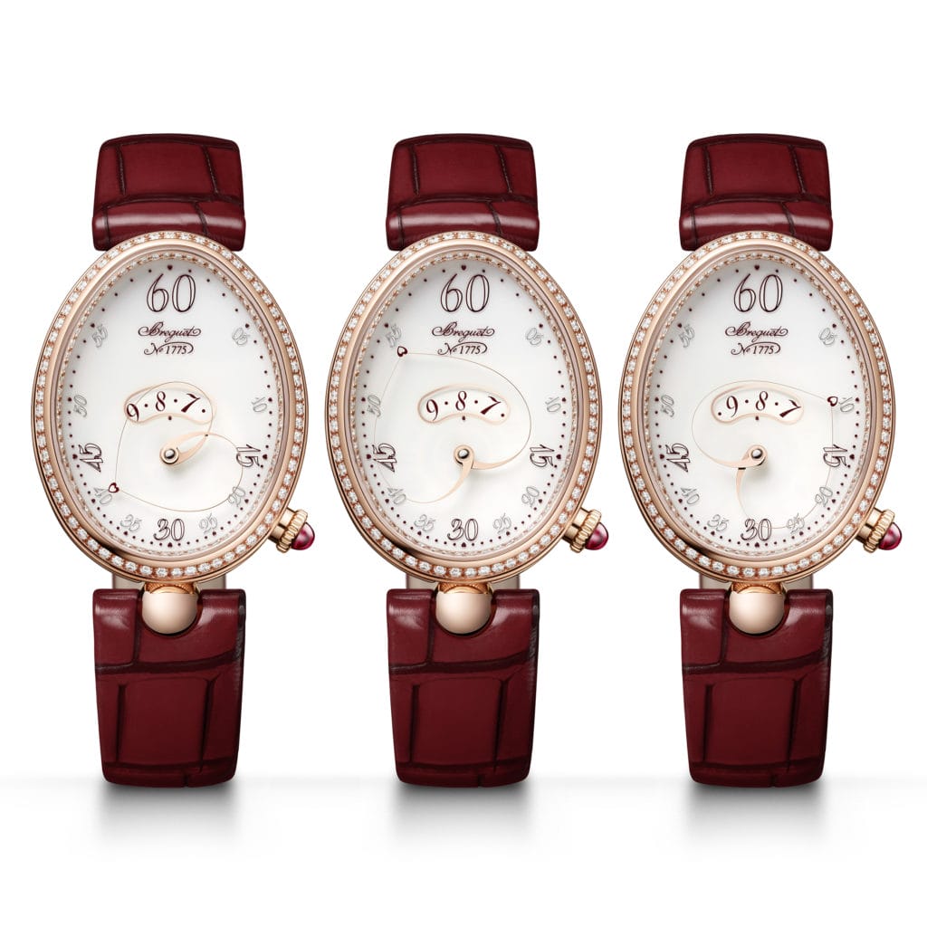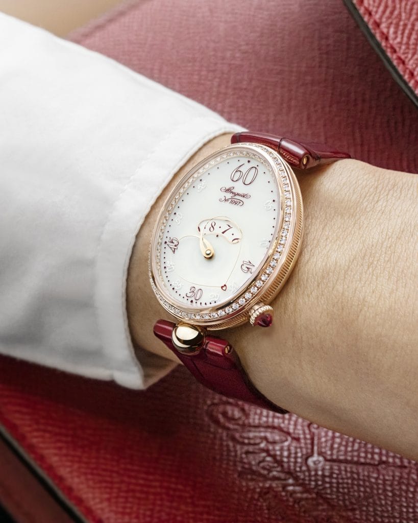 Aujourd’hui, pour sa nouvelle création dédiée aux femmes et à l’amour, la Maison a imaginé un nouveau procédé protégé par plusieurs brevets. La magie d’un ingénieux mécanisme modifie la forme de cœur de l’aiguille des minutes – décentrée à 6 heures – selon sa position sur le cadran ovoïde. Breguet, qui a toujours développé pour les femmes des montres particulières qui leur étaient spécialement dédiées, est ainsi fidèle à son histoire et à sa culture. Pour cette nouvelle création, les courbes s’étendent lorsque l’aiguille parcourt la moitié supérieure du cadran et se resserrent sur sa partie inférieure. Un véritable cœur qui bat…Un cadran épuré fait la part belle à ce spectacle d’une grande finesse et d’un grand romantisme. Des touches de rouge vermillon intensifient les lignes du tour d’heures, le bracelet en cuir ainsi que la couronne, ornée d’un rubis. Or rose et diamants complètent cette composition aussi luxueuse qu’exclusive.
