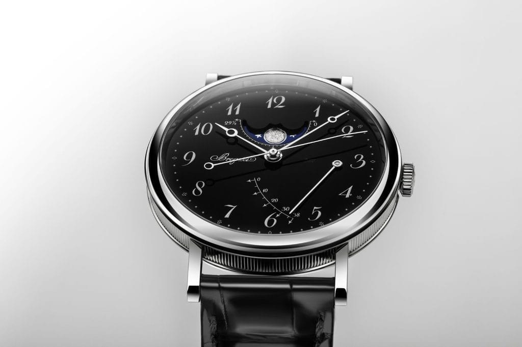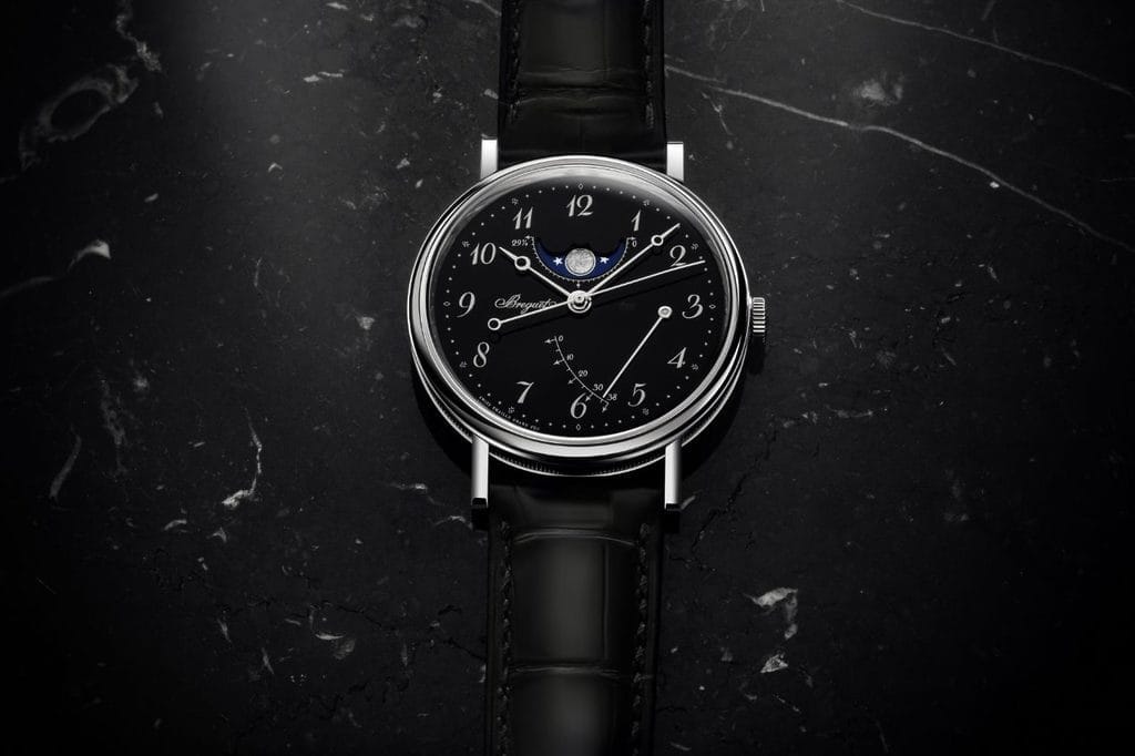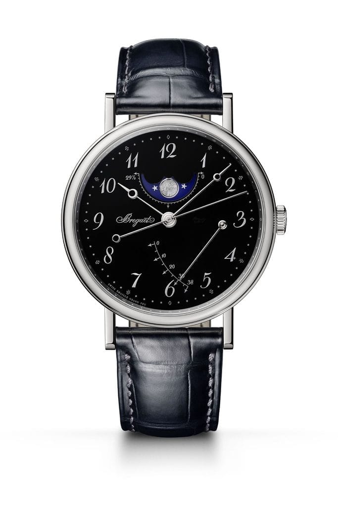 La Classique de Breguet se distingue par un visage sombre et élégant, rehaussé par l’éclat de l’émail « Grand Feu » et entouré d’un boîtier en platine, symbole d’excellence. Ce modèle, la référence 5177, affiche les phases de lune et la réserve de marche avec la référence 7787.