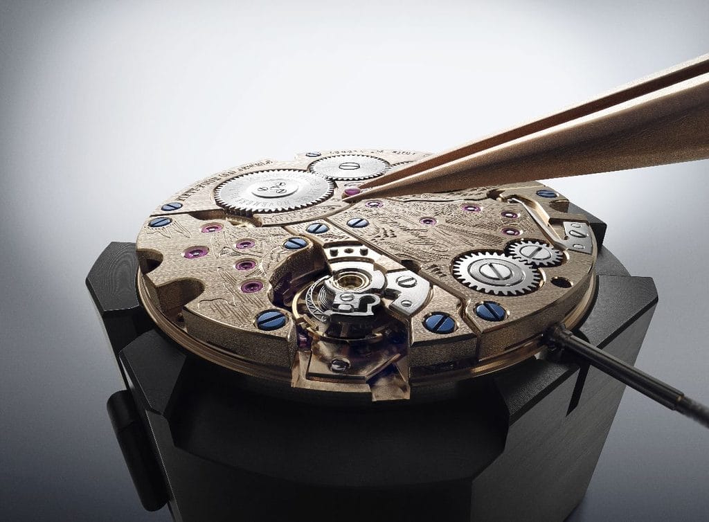 Les artisans joailliers ont imaginé plusieurs corolles mobiles entièrement façonnées à la main. L’ensemble est pavé de diamants baguette. Chaque anneau, concentrique et ovoïde, reprend avec précision la silhouette emblématique de la collection. Les pierres sont serties individuellement dans une structure en or Breguet qui garantit leur liberté de mouvement. Avec souplesse et légèreté, la montre s’anime au rythme du poignet, restituant les ondulations de la composition avec une fluidité remarquable.