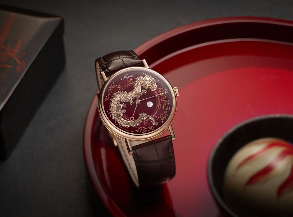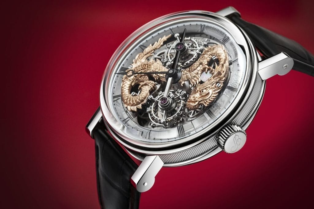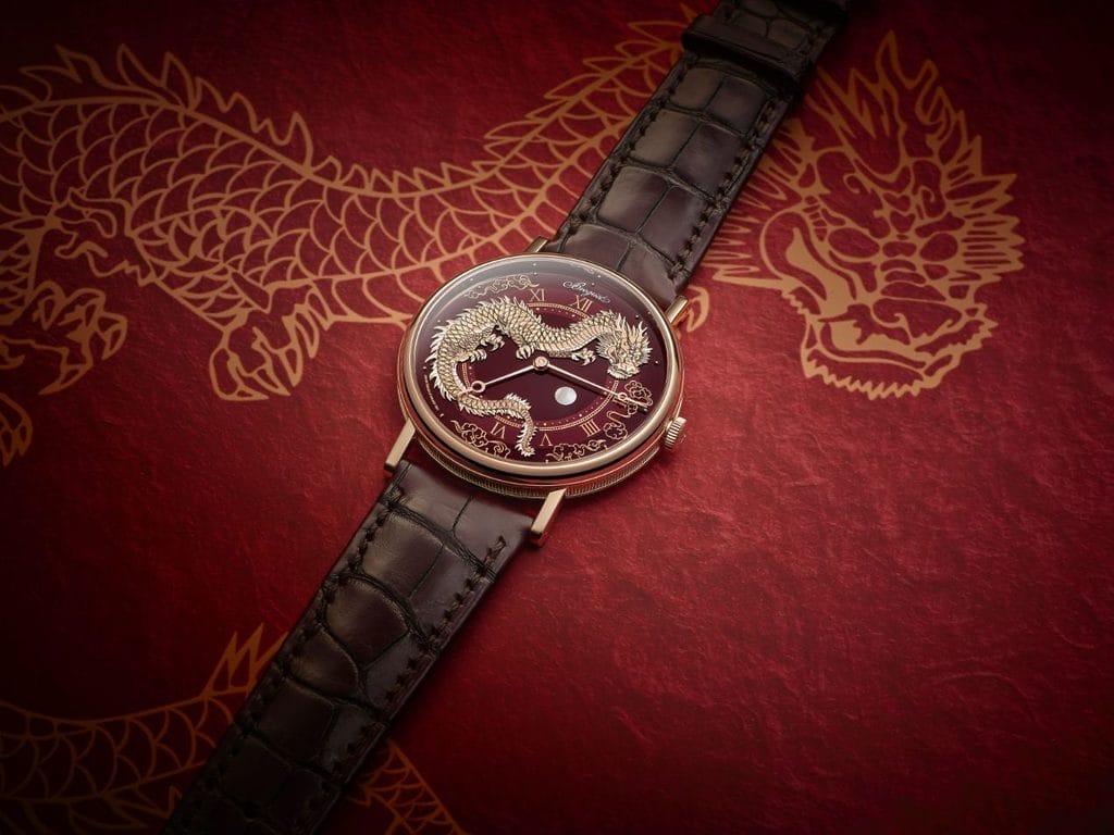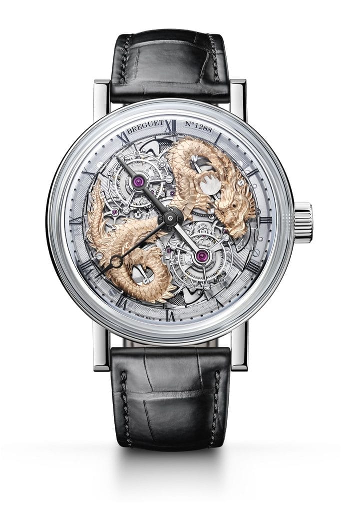 Aujourd’hui, la marque met en lumière une version dans laquelle un dragon virevolte entre les deux tourbillons. Fixé sur les deux ponts de barillet, ce dragon en or est entièrement gravé à la main. Il agrippe entre ses serres une perle en nacre. Selon la légende, celle-ci posséderait l’essence sacrée qui confère au dragon son pouvoir. Elle serait également la représentation de la sagesse. L’empereur, symbolisé par cette créature, étant alors celui qui dirige son empire avec sagesse.