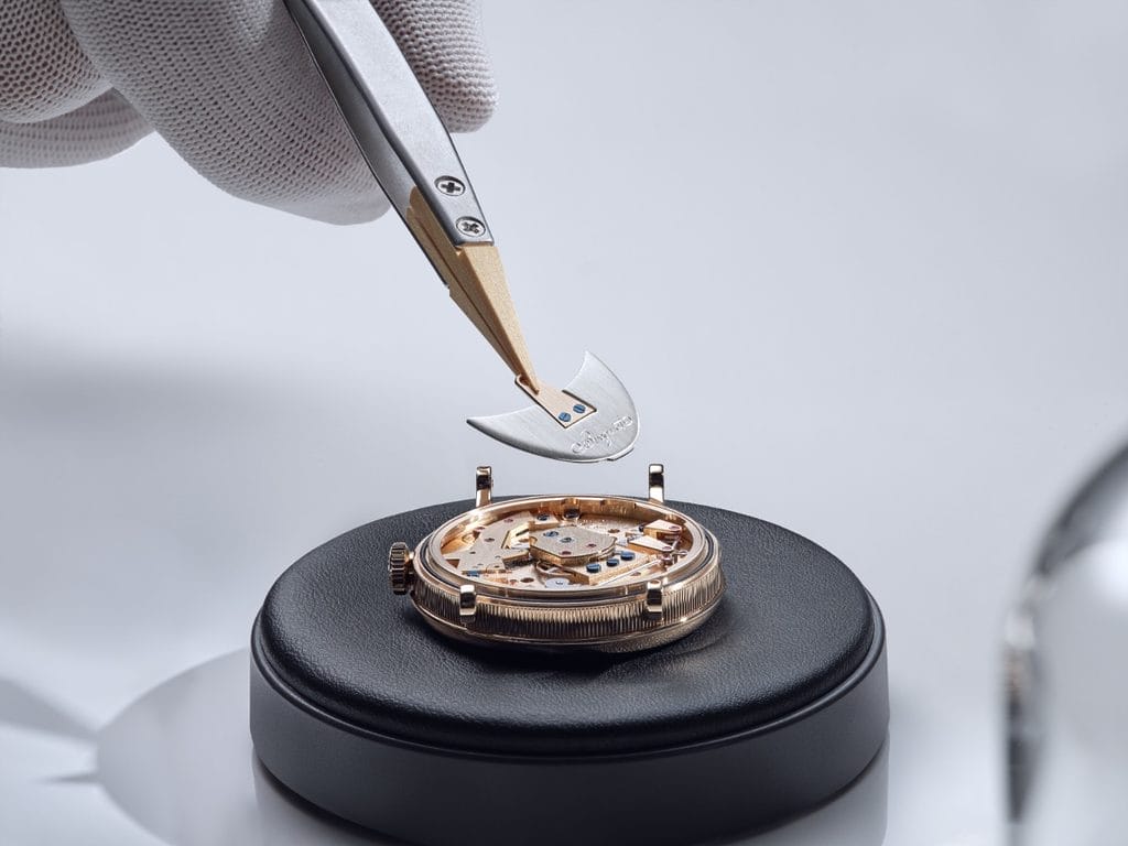 Avec cette création, la Maison introduit deux teintes devenues signatures : l’or Breguet et le bleu Breguet. Le premier est un alliage exclusif mêlant or pur, argent, cuivre et palladium. Il habille la boîte de 38 mm, la platine grenaillée ainsi que les ponts finement satinés, créant un jeu de textures et de reflets particulièrement raffiné. Le second, appliqué sur les vis et la seconde rétrograde, renforce le contraste et affirme l’identité chromatique de la Maison.