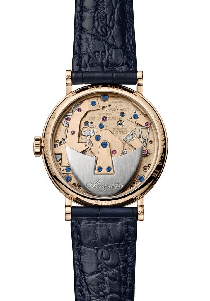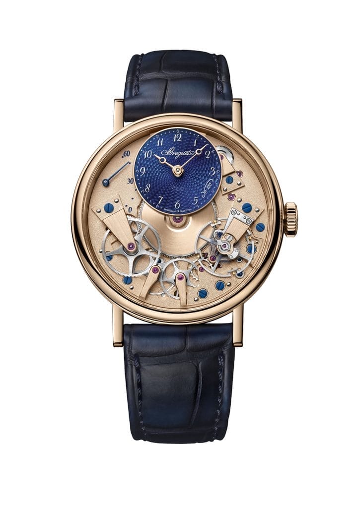 Avec cette création, la Maison introduit deux teintes devenues signatures : l’or Breguet et le bleu Breguet. Le premier est un alliage exclusif mêlant or pur, argent, cuivre et palladium. Il habille la boîte de 38 mm, la platine grenaillée ainsi que les ponts finement satinés, créant un jeu de textures et de reflets particulièrement raffiné. Le second, appliqué sur les vis et la seconde rétrograde, renforce le contraste et affirme l’identité chromatique de la Maison.