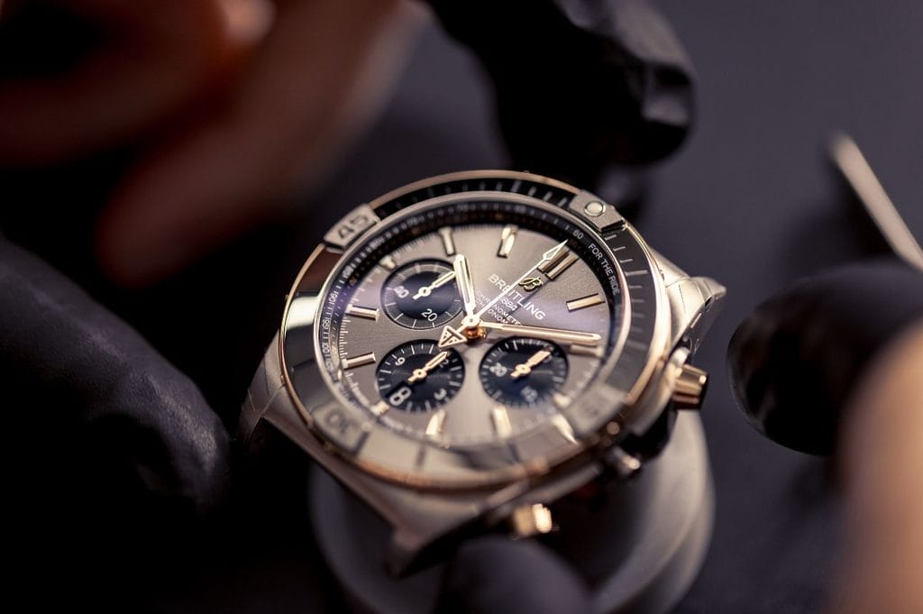 Initialement conçue pour l’équipe italienne de voltige Frecce Tricolori en 1983, la Chronomat a rompu avec la tendance du quartz en remettant les chronographes mécaniques au goût du jour.