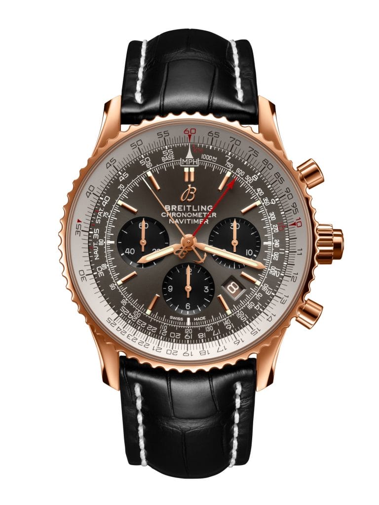 La Navitimer B03 Chronograph Rattrapante 45, dont l’esthétique est doublée d’une prouesse technique, est dotée d’un imposant boîtier de 45 mm en or rouge 18 carats et se distingue par son cadran gris Stratos. Ses index ainsi que ses aiguilles des heures et des minutes sont rehaussés de Super-LumiNova® qui facilite la lecture de l’heure quelles que soient les conditions de luminosité. La montre arbore une lunette tournante bidirectionnelle et la célèbre règle à calcul circulaire caractéristiques des Navitimer de Breitling.