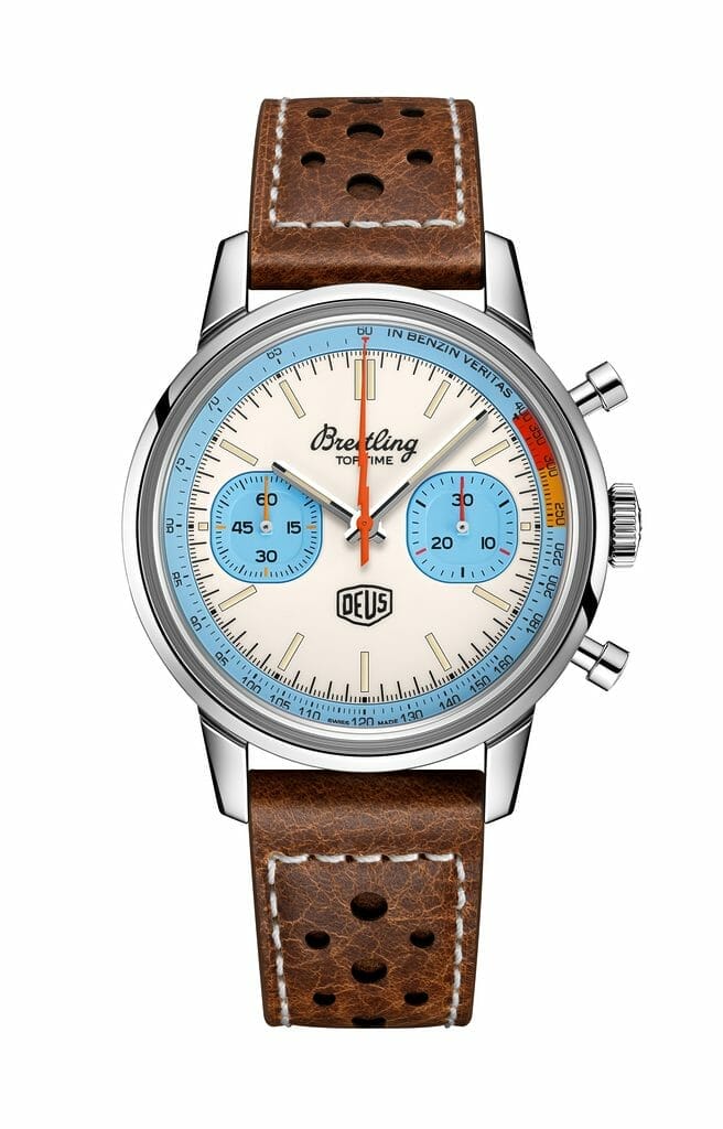 Limitée à 2000 exemplaires, la nouvelle Top Time Deus est conçue pour les aventures en plein air grâce à ses index avec revêtement luminescent et son cadran laqué blanc contrasté par des touches de turquoise sur le rehaut et sur les compteurs, ainsi qu’une échelle tachymétrique pour mesurer la vitesse. Même si elle arbore de nouvelles couleurs, les détails qui ont fait le succès de la première collaboration sont de retour, notamment l’aiguille de chronographe en forme d’éclair, les poussoirs champignon, le bracelet en cuir de veau sur le thème de la course automobile et la gravure d’une moto Deus et de son pilote sur le fond de boîtier dessinée par Carby Tuckwell, le directeur artistique de Deus. Chaque fond de boîtier est gravé de la mention « One of 2000 ». Georges Kern, PDG de Breitling, déclare : « La Top Time Deus est une montre à la fois décontractée, robuste et élégante, tout comme la personne pour laquelle elle a été pensée. Son look moderne rétro s’accorde à merveille avec le style des planches de surf et des motos de Deus ».