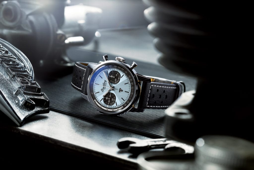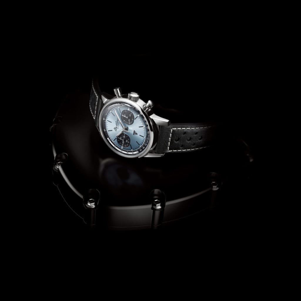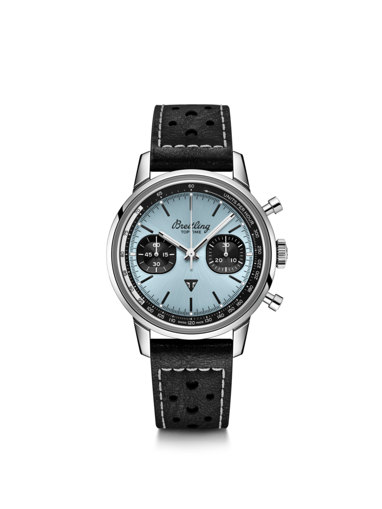 L’élément phare de ces deux montres est le cadran bleu glacier. Cette couleur unique rappelle deux références majeures : la Triumph Thunderbird 6T bleue de 1951 et la Breitling Top Time Réf. 815 avec son cadran bleu, modèle rare lancé dans les années 1970.