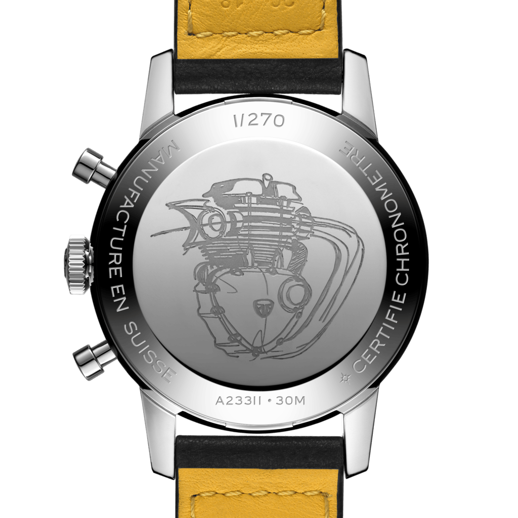 Les caractéristiques de ces modèles incluent un bracelet en cuir de veau discret au style de course motorisée qui met en valeur le cadran vedette, les logos Breitling et Triumph, subtilement placés à 12 et 6 heures, des poussoirs champignon surdimensionnés qui permettent un contrôle aisé des fonctions départ-arrêt et remise à zéro du chronographe, ainsi qu’une échelle tachymétrique contrastante qui offre une lisibilité optimale des informations concernant la vitesse. Les montres sont animées par le Calibre Breitling 23, un chronomètre certifié COSC et doté d’une réserve de marche d’environ 48 heures. Et parmi les caractéristiques qui raviront les collectionneurs : le croquis détaillé du moteur de la moto jumelle Triumph gravé sur les fonds de boîtier.