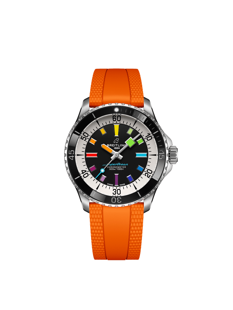 Le lien de Breitling avec le grand bleu prend une tournure chromatique avec la présentation de la Superocean Automatic 42 et 36 aux cadrans arc-en-ciel. Elle s’accompagne d’une nouvelle version du modèle à cadran turquoise 44 mm le plus vendu, désormais doté d’un bracelet ton sur ton.