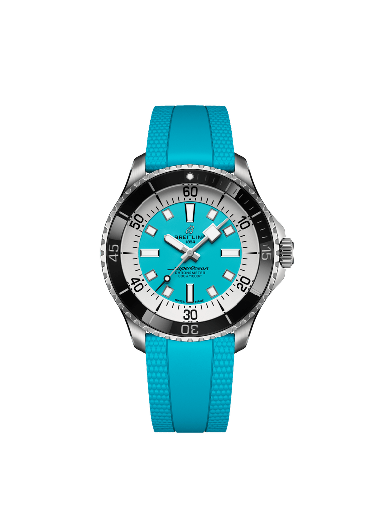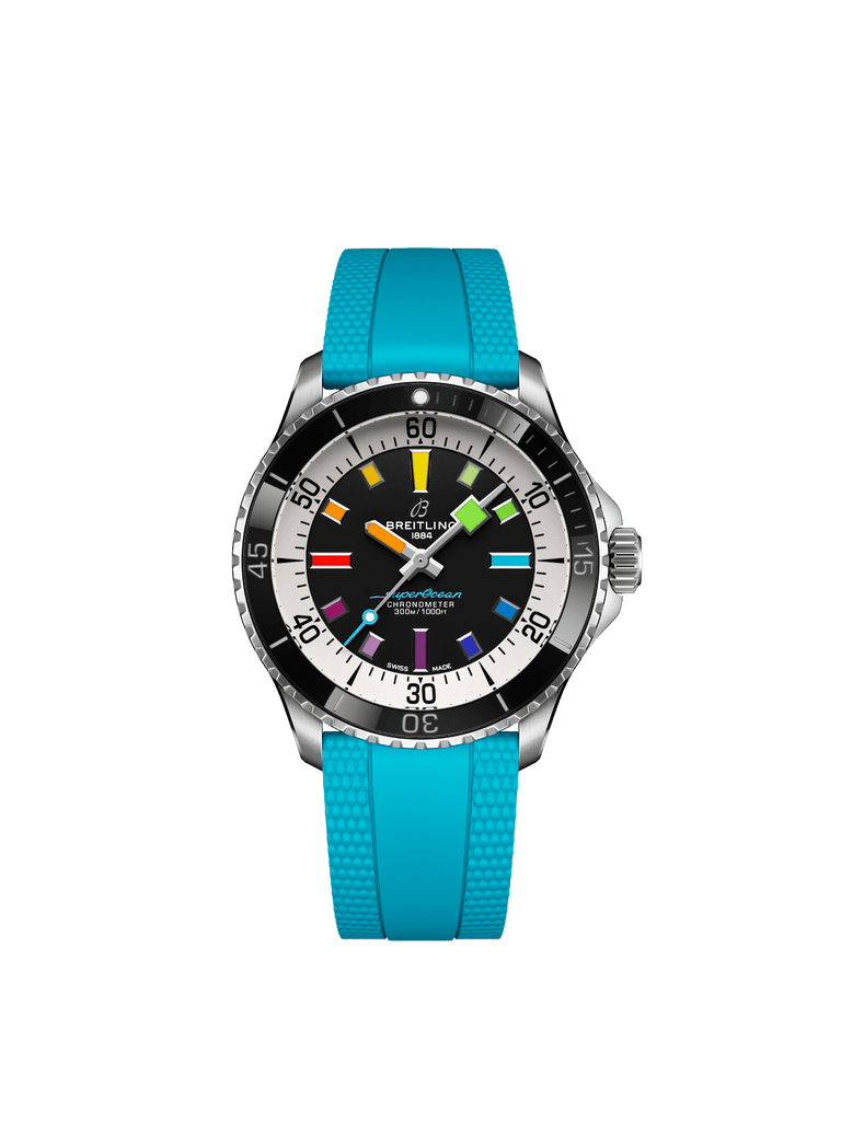 Le lien de Breitling avec le grand bleu prend une tournure chromatique avec la présentation de la Superocean Automatic 42 et 36 aux cadrans arc-en-ciel. Elle s’accompagne d’une nouvelle version du modèle à cadran turquoise 44 mm le plus vendu, désormais doté d’un bracelet ton sur ton.