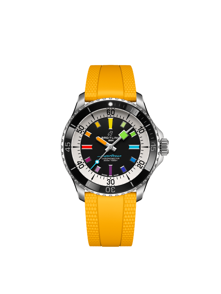 Fabriquée en titane ultraléger, la Superocean Automatic 46 Super Diver est proposée sur un bracelet en caoutchouc de couleur assortie ou d’un bracelet en titane épuré : une fonctionnalité haut de gamme alliée à un style nautique.