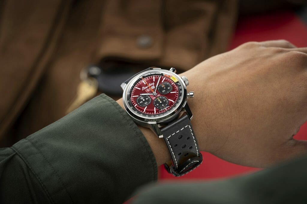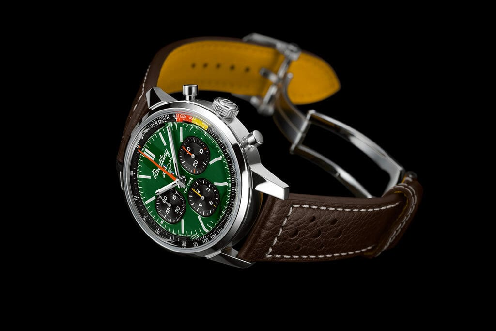 Les éléments de design comprennent le bracelet en cuir perforé sur le thème de la course automobile, un tachymètre pour mesurer la vitesse et des sous-cadrans contrastants « squircle » (mi-rond, mi-carré) qui évoquent les jauges des tableaux de bord vintage. Tout comme son prédécesseur des années 1960 axé sur le style, le boîtier en acier inoxydable de 41 mm de la Top Time est confortable pour les amateurs de voitures et de montres de tous bords.