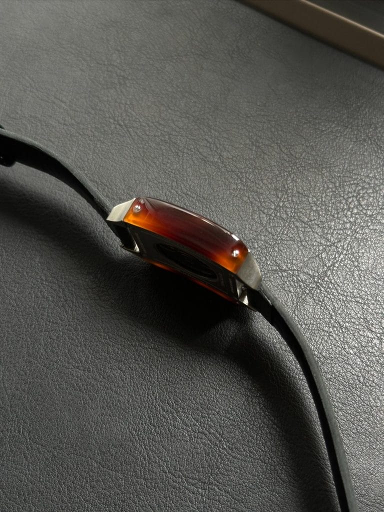 Autre détail notable : la couronne positionnée à 12 heures, discrètement encastrée dans la boîte, est surmontée d’un cabochon en lapis-lazuli, clin d’œil aux montres de poche d’antan et aux objets précieux. Ce petit bijou de design, presque caché, témoigne du soin apporté aux finitions.