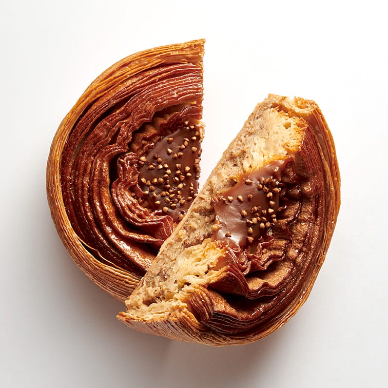 Une frangipane moelleuse accompagnée d’une brioche feuilletée garnie de caramel au sarrasin et de fleur de sel, pour une galette onctueuse et unique.
