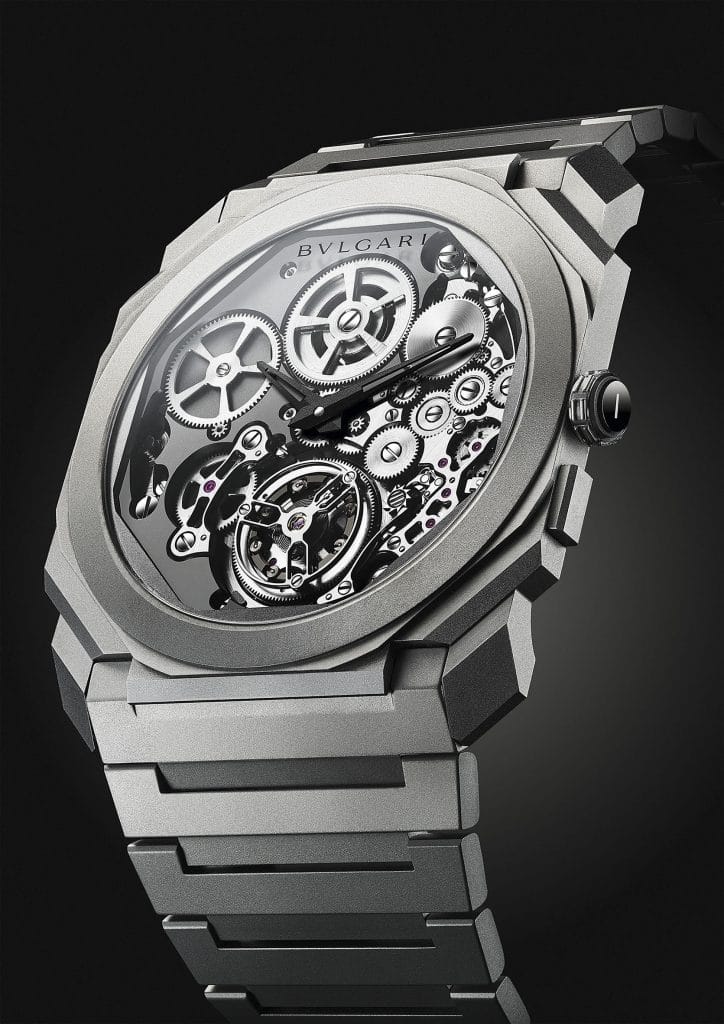 Cette modernité se forge dans l’audace mais trouve ses racines dans la beauté de l’art horloger. La finesse d’une montre repose sur la capacité à repenser, redessiner, remodeler les volumes. C’est un travail global, portant sur tous les éléments de la montre, aussi bien la boîte et le bracelet que chaque composant du cadran ou du mouvement. Bvlgari a fait le choix d’un matériau ultra-contemporain, le titane, gage de résistance et de légèreté.