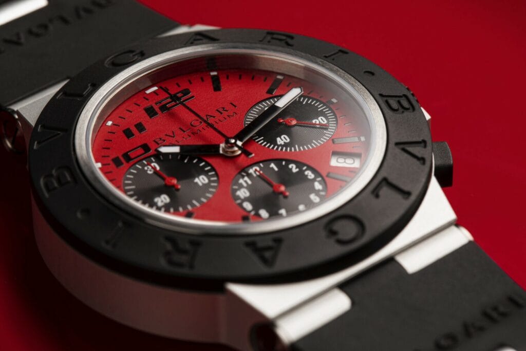 L’édition Bulgari Aluminium Ducati Special Edition redéfinit les normes de ce que peut être une montre de sport de luxe. Le chronographe présente un superbe cadran de couleur rouge Ducati et trois compteurs au style sportif inspiré des graphiques du compte-tours Ducati : fond noir, index blancs, sphère rouge. Les index des heures font également référence à l’esthétique du constructeur de motos italien.