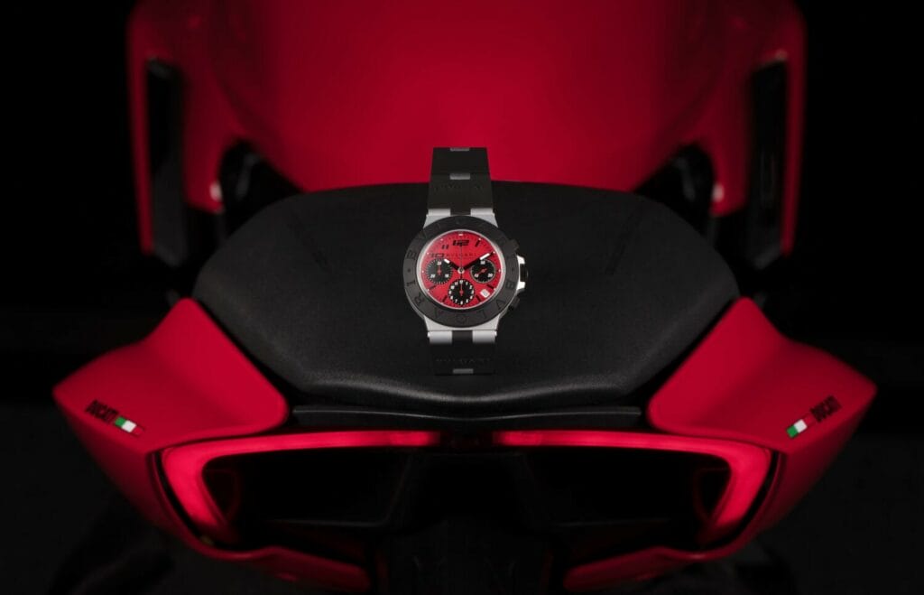 Cette collaboration donne naissance au chronographe Bulgari Aluminium Ducati Special Edition, une élégante montre sportive produite en édition limitée à mille exemplaires qui célèbre l’union entre la Maison de joaillerie et l’emblématique constructeur de motos italien. Une combinaison d’excellence, de performance et de passion.