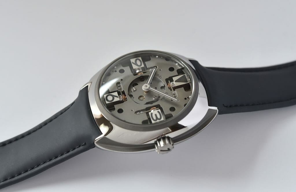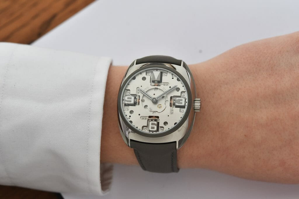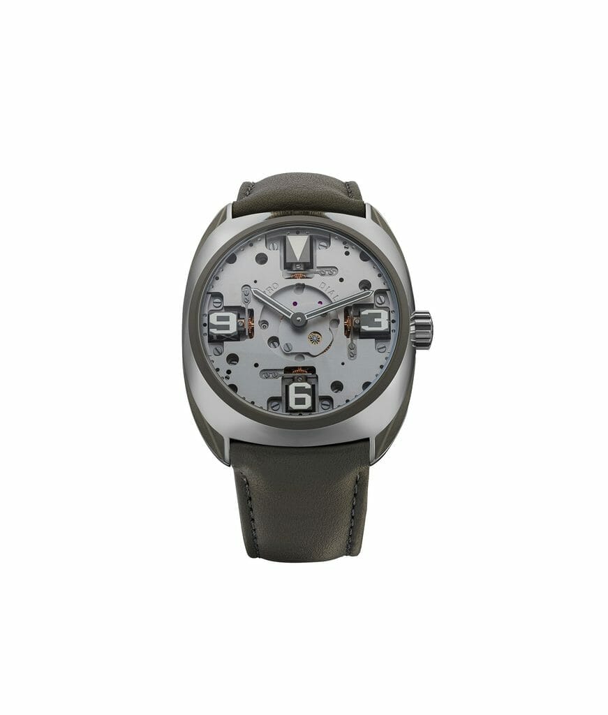 Le nouveau boitier toujours fait dans un bloc de titane grade 5 a été redessiné, retaillé sur ses flancs, affiné, profilé au plus loin des lignes de l’ensemble. Coiffé d’une lunette, désormais sablée, comme la platine, l’ensemble offre un aspect homogène dans les nuances de gris sombre métallique, à la fois brut, mat, noir, au style racé et industriel qui, combiné à la technologie et la qualité suisse, est particulièrement élégant. Poussant le concept jusqu’au bout, le nom de la marque s’efface pour un design encore plus pur. Complété par deux bracelets en rubber – vert et vert gris – la montre a une personnalité forte, contemporaine sans être ostentatoire.