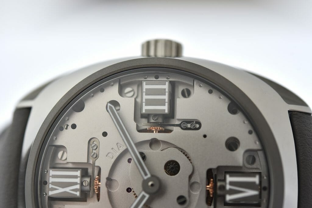 Ainsi, la minuterie est directement gravée sur la platine et comporte des finitions avec SuperLuminova™ pour la rendre parfaitement lisible Les quatre cubes mobiles et permutables, ici plus présents encore, élargis, toujours aux quatre points cardinaux du cadran, sont décorés d’un rhodiage ton-sur-ton, subtilement différent de la platine afin d’augmenter l’aspect architectural de l’ensemble, créant un léger et élégant contraste entre les divers éléments.