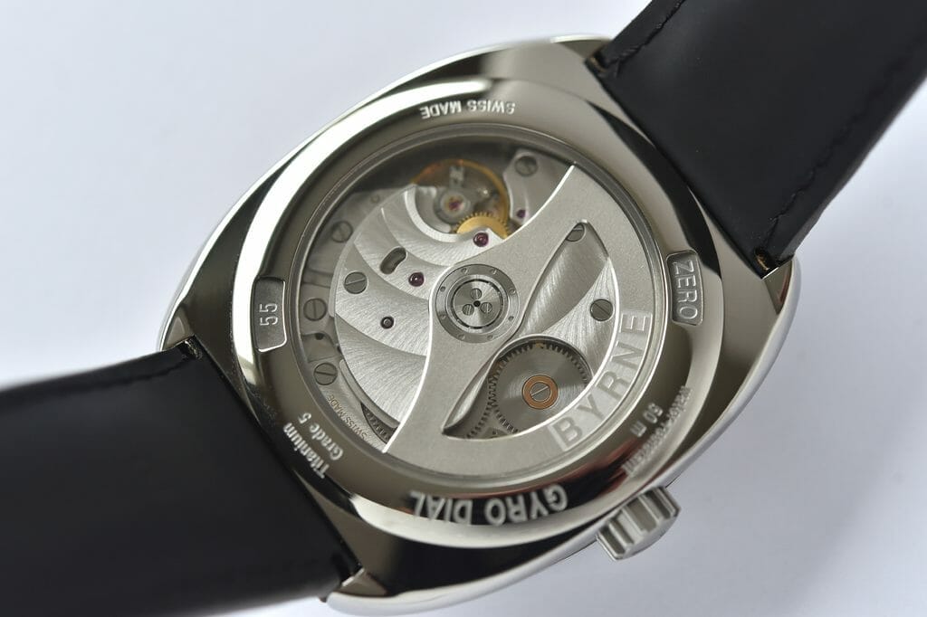 Sous l’impulsion de John Byrne son créateur, trois années de recherches et développement en Suisse à Fleurier ont été nécessaires pour donner naissance à cette complication animation brevetée. Le calibre 5555, a été entièrement redessiné pour la GyroDial ZERO. Dans ses longues courbes souples faites de titane, le mouvement/cadran aux finitions étirées à la main présente une esthétique contemporaine et très racée.