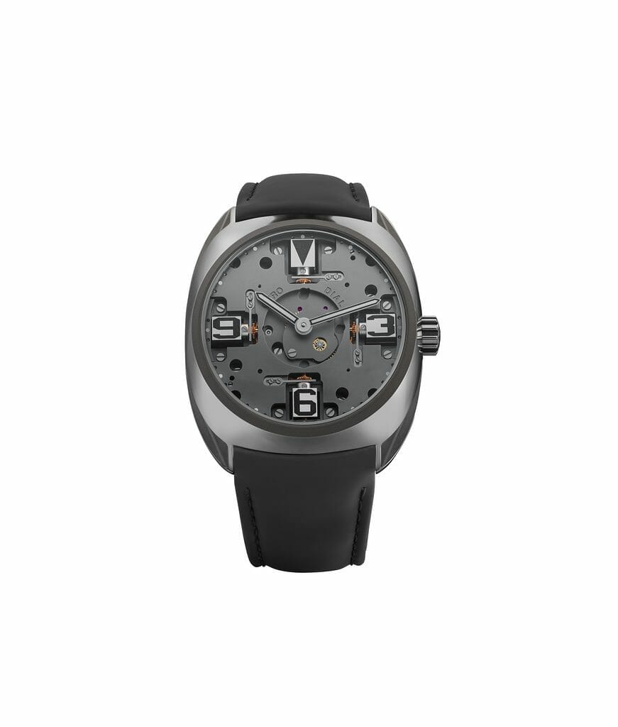 Mis à nu, dévoilé, le mouvement de la GyroDial ZERO est mis en lumière, et devient le cadran de la montre. Multiples variations de gris, les composants se révèlent. Ponts, vis, platine, cubes amovibles traités Rhodium silver ou Rhodium black, la GyroDial ZERO repart de zéro, offrant au porteur la pleine vision de la belle mécanique.