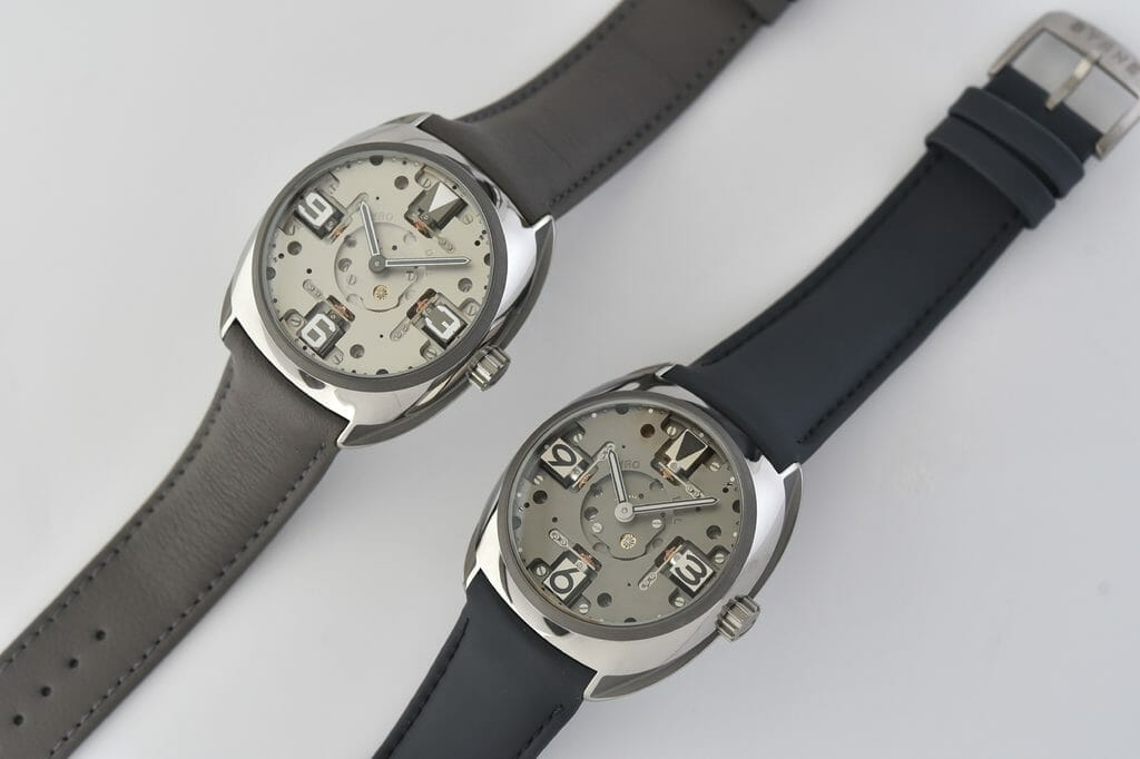 Une montre, quatre apparences qui vous sont proposées, sans rien à faire, chaque matin. Chiffres romains, chiffres arabes, cadran invisible ou cadran Sport avec des chiffres inspirés des maillots de sport réhaussés de SuperLuminova… Grâce à son mouvement développé sur-mesure, Byrne invente la montre dont le cadran change d’humeur tous les jours. Chaque jour à minuit ou à midi, ou sur demande, les quatre principaux index du cadran de la GyroDial ZERO changent, portés par des cubes rotatifs, au saut instantané.