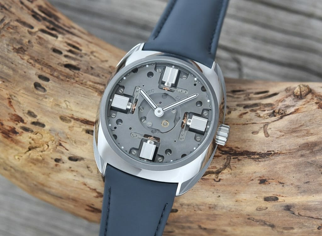 Le nouveau boitier toujours fait dans un bloc de titane grade 5 a été redessiné, retaillé sur ses flancs, affiné, profilé au plus loin des lignes de l’ensemble. Coiffé d’une lunette, désormais sablée, comme la platine, l’ensemble offre un aspect homogène dans les nuances de gris sombre métallique, à la fois brut, mat, noir, au style racé et industriel qui, combiné à la technologie et la qualité suisse, est particulièrement élégant. Poussant le concept jusqu’au bout, le nom de la marque s’efface pour un design encore plus pur. Complété par deux bracelets en rubber – vert et vert gris – la montre a une personnalité forte, contemporaine sans être ostentatoire.