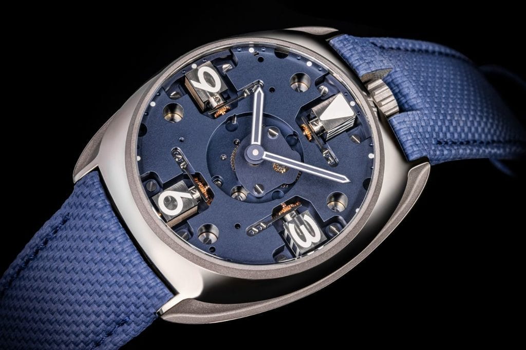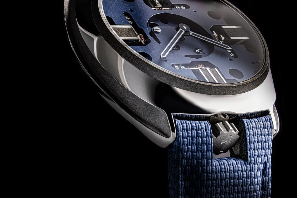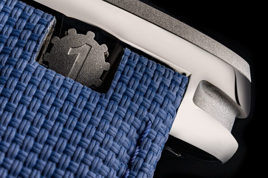 Enfin, pour un maximum de confort et de facilité d’usage, dans l’eau (étanche à 50 mètres) ou au bureau, la tête de la montre a été dessinée pour pouvoir accueillir les inserts d’un bracelet en caoutchouc grainé du même bleu que les indexes et la platine, qui épouse parfaitement les formes du remontoir, et est complété par une boucle en titane qui garantit la pleine sécurité.