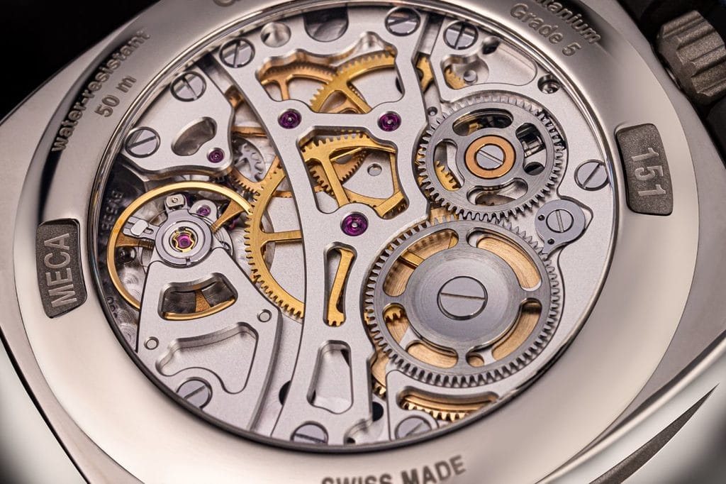 Flancs évidés – dessinés comme des alcôves aux finitions polies et satinées, volumes plus tendus, le boîtier aux lignes originales inspiré de l’arrière d’une Porsche 911, a été redessiné en profondeur, offrant une forme allégée de 30%, plus petite et plus fine que jamais. Taillé dans un bloc de titane Grade 5 permettant un poids total optimisé de 70 grammes, le boîtier d’un diamètre de seulement 36mm sur la largeur – et 38 mm au niveau de l’entre-cornes – et 12.5 mm d’épaisseur promet légèreté, confort et élégance sur le poignet.