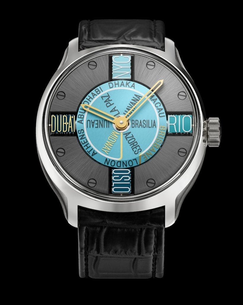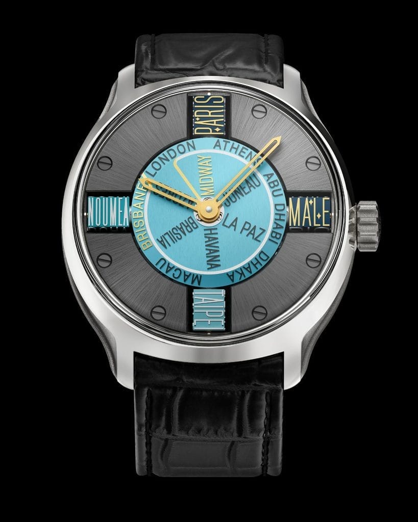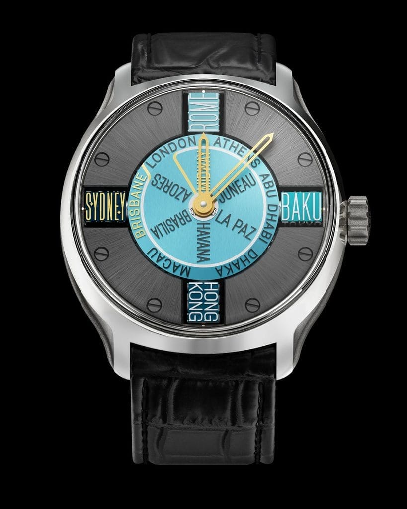 Les cubes du cadran, représentant 16 villes chères à John Byrne, n’indiquent pas seulement l’heure, mais le moment de la journée dans ces lieux.