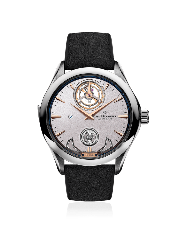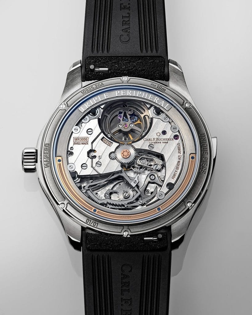 La Manero Minute Repeater créée pour la Dubaï Watch Week présente pour la première fois le summum de la finesse horlogère de CFB dans un boîtier en titane. L’association d’un cadran en or gris 18 carats, décoré d’un motif grainé, et d’aiguilles et d’index en or rose, confère à la montre une allure à la fois élégante etsobre,sansfioritures inutiles ni finitions trop ouvragées. En tant que «Triple Peripheral», elle possède non seulement un mécanisme de remontage automatique périphérique et un tourbillon «suspendu», mais également un régulateur à répétition minutes guidé parsa périphérie. Ils’agit du véritable cœur de l’une desréalisations les plus incroyables de l’horlogerie: il contrôle des marteaux miniatures qui frappent des timbres pour sonner heures, quarts d’heure et minutes de manière audible. C’est là que le boîtier en titane de la montre prend tout son sens: parmi toutes les répétitions minutes de CFB à ce jour, cette pièce unique offre une tonalité et une résonance particulières qui retentissent plus clairement et plus «brillamment» qu’aucune autre avant elle.