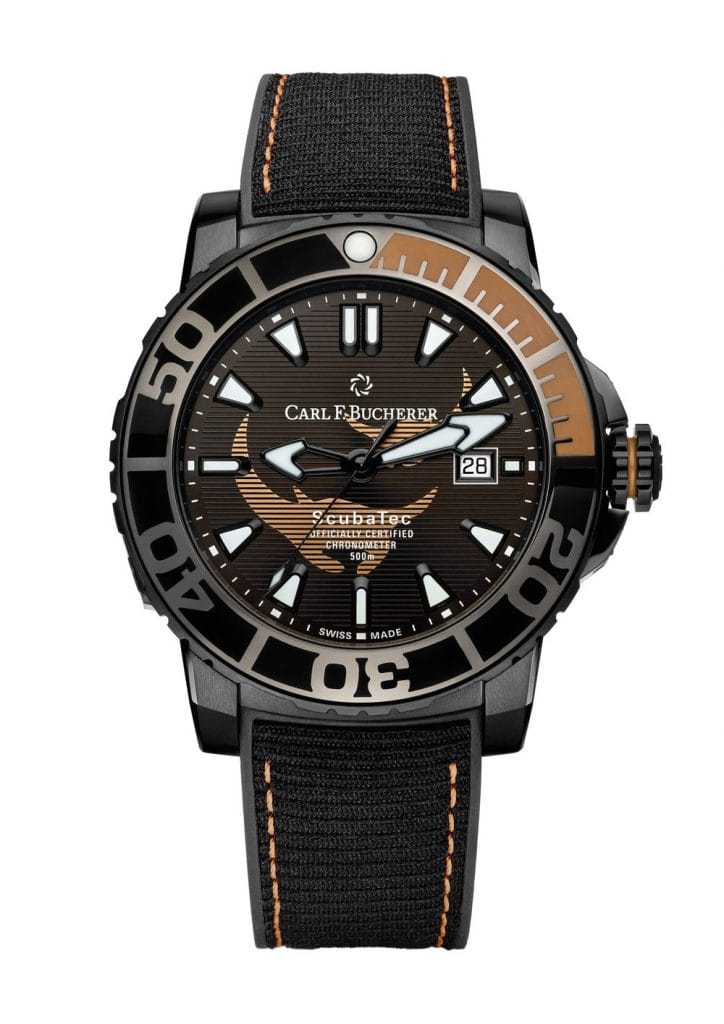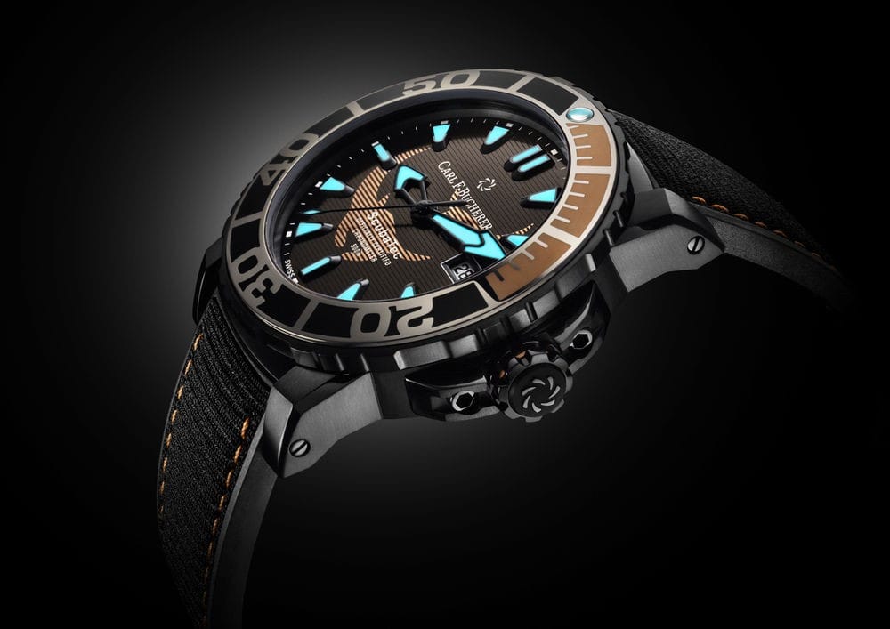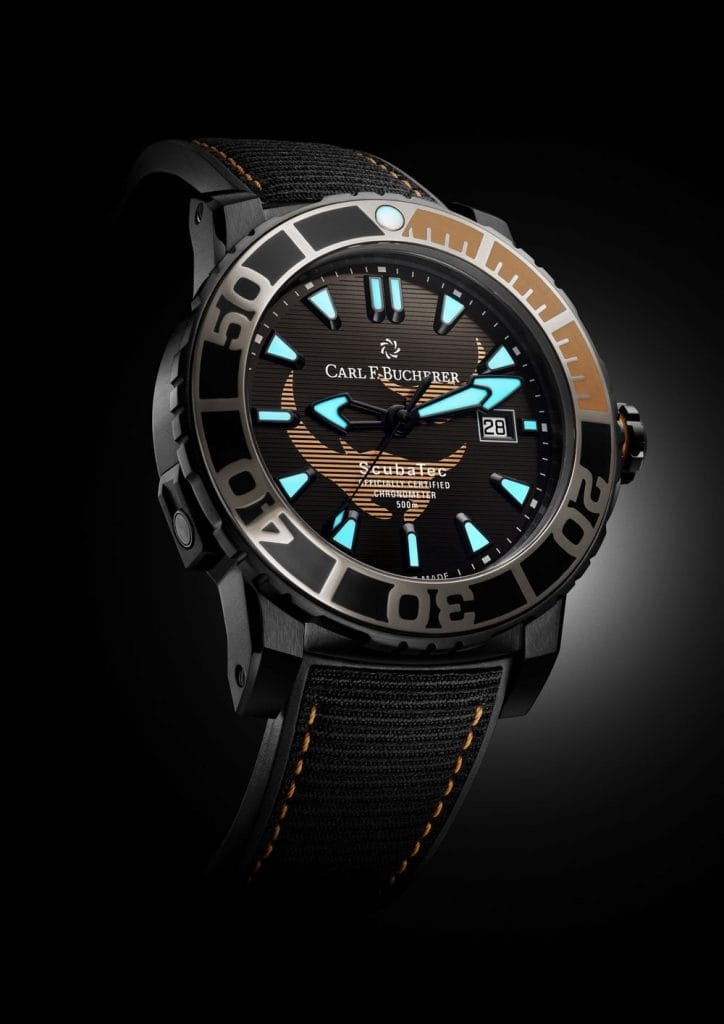 Le modèle en édition non limitée «Black Manta» allie un style sportif et élégant à la robustesse d’un garde-temps aux fonctions pratiques, étanche jusqu’à 50 bar (500 m). Son boîtier en titane de 44,6 mm, une nouveauté chez Carl F. Bucherer, présente un revêtement DLC dont le noir apporte un contraste aux éléments de couleur bronze – clin d’œil aux montres de plongée historiques. Les index et aiguilles, dotés d’un revêtement Super-LumiNova, encadrent les silhouettes de deux raies manta sur le cadran noir. La lunette tournante unidirectionnelle en céramique permet de régler les temps de plongée, une fonction assurant la sécurité du plongeur, à l’instar de la valve à hélium automatique. Le fond de boîte en titane avec revêtement DLC est orné d’une estampe détaillée d’une raie manta noire. Dans le cœur de la montre, le calibre automatique CFB 1950.1 bat avec une réserve de marche de 38 heures. Sa précision extraordinaire est officiellement certifiée par l’institution indépendante Contrôle Officiel Suisse des Chronomètres (COSC): chaque modèle s’accompagne d’un certificat individuel.