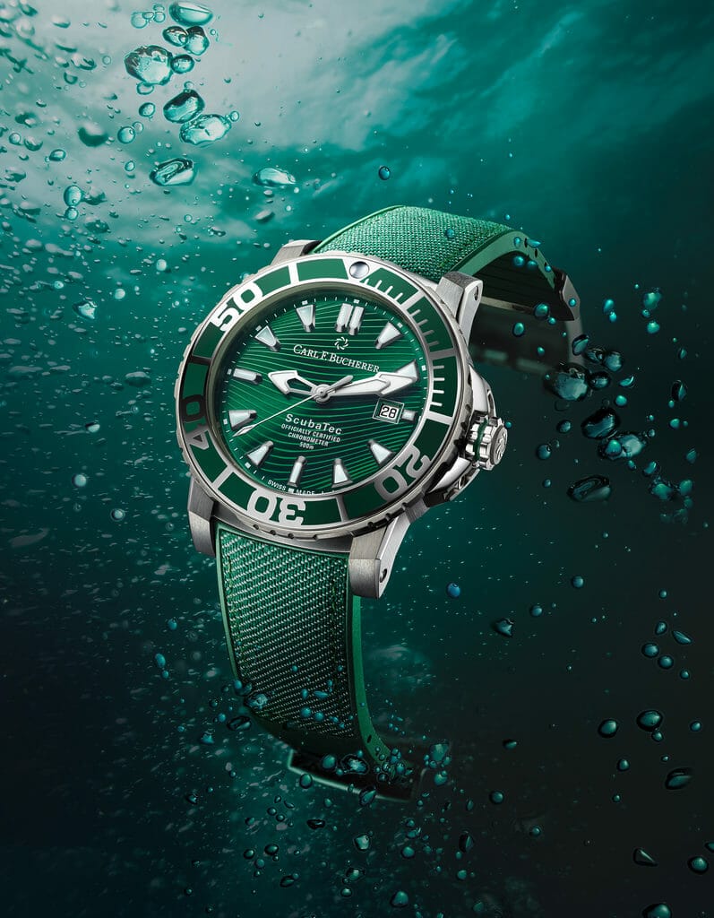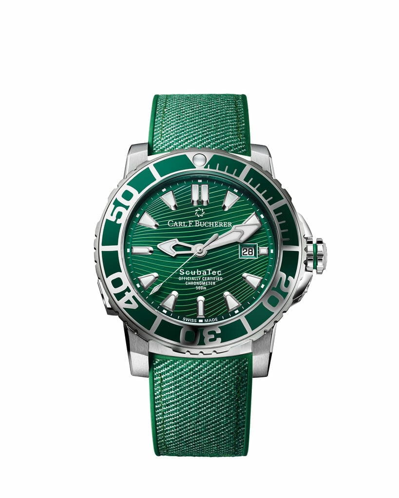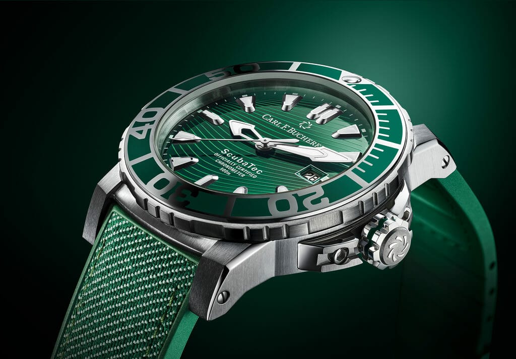 La Patravi ScubaTec Verde est parfaitement adaptée à des entreprises de ce type. Étanche jusqu’à 50 bar (le niveau le plus profond que CFB propose sur ses montres de plongée), ce garde-temps est équipé de joints d’étanchéité et d’une couronne vissée, ainsi que d’une valve à hélium automatique assurant l’évacuation du gaz pendant la descente et l’ascension, afin de prévenir tout dommage occasionné au boîtier. Son épaisse glace saphir présente un traitement antireflets sur les deux faces. Les aiguilles et les index sont remplis de Super-LumiNova®, qui assure une excellente lisibilité même dans les profondeurs les plus sombres. La lunette tournante unidirectionnelle affiche un point en Super-LumiNova® pour une orientation optimale. La boucle déployante finement ajustable avec extension plongeur constitue un élément de fonctionnalité supplémentaire essentiel sous l’eau.