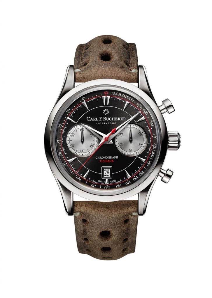 Carl F. Bucherer accueille une nouvelle variante, de style rétro, dans sa collection très prisée, Manero Flyback. Ce chronographe de caractère, doté d’une fonction flyback, est dédié à l’homme du monde qui veut toujours avoir au poignet un petit morceau du grand art horloger suisse de Lucerne. Cette montre surprend par l’alliance de couleurs osées, mais cependant discrètes, de son boîtier en acier, par ses totaliseurs argentés, des touches de rouge et son bracelet en cuir de koudou d’un brun doré.