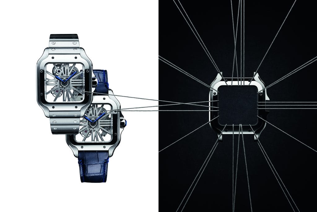 – Idem pour les huit vis de la lunette : fonctionnelles, elles sont le reflet miniature d’une architecture urbaine en plein essor qui introduit la mécanique et l’acier dans toutes ses structures monumentales. Avec elles, Cartier ose montrer ce que l’on cachait jusqu’alors.