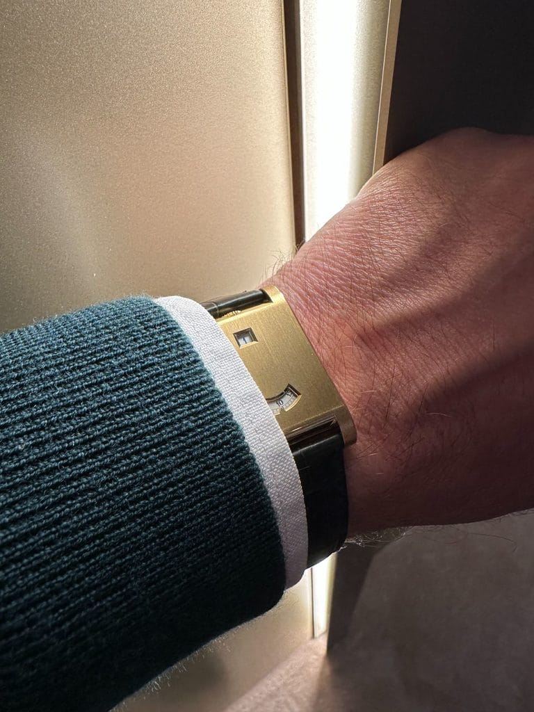 La lisibilité des chiffres dorés, posés sur des disques ton sur ton à la finition soignée, témoigne d’une recherche poussée sur le confort visuel — malgré l’absence de cadran au sens traditionnel. La montre ne cherche pas à se faire remarquer. Elle attend qu’on la découvre.