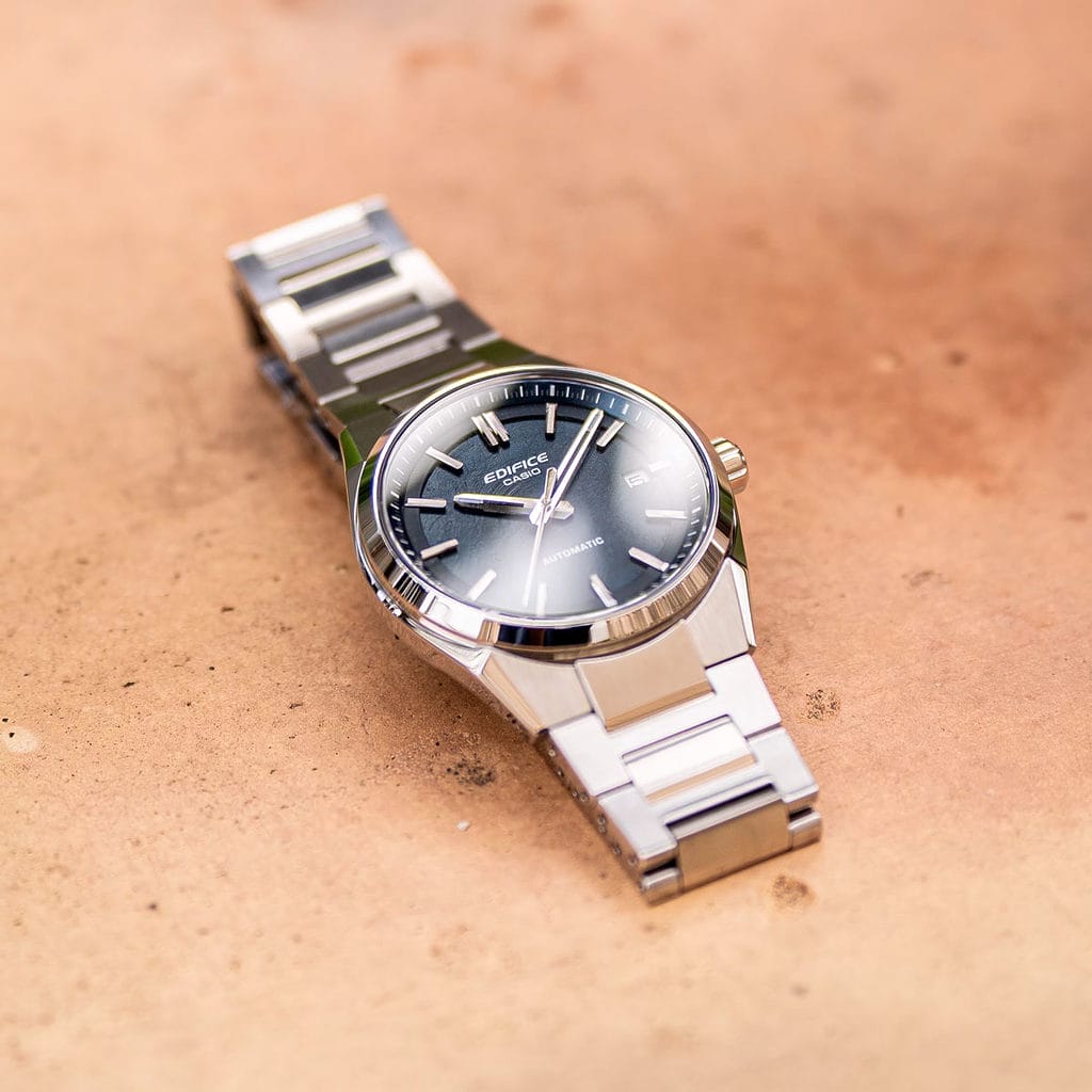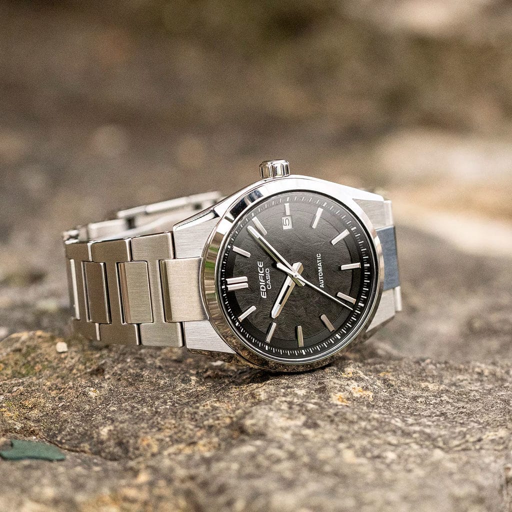 Le vrai supplément d’âme semble toutefois avoir été placé ailleurs, sur le cadran. Une texture particulière a été obtenue par électroformage, avec un rendu de surface qui évite la banalité. Ce choix est loin d’être anecdotique. Dans une catégorie tarifaire où l’uniformité domine souvent, un peu de matière, un peu de relief et un peu de personnalité sont apportés. Les index appliqués, les aiguilles glaive ajourées avec matière luminescente et le travail alterné entre surfaces brossées et polis miroir sur la boîte et le bracelet viennent renforcer cette impression. Une montre plus soignée qu’attendu est ainsi suggérée, sans que l’identité EDIFICE ne soit totalement abandonnée.