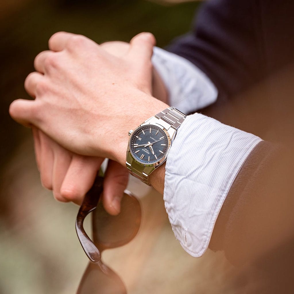 Le choix du format doit aussi être salué. Avec 43 x 38 x 11,8 mm, l’EFK-110D se place dans des proportions devenues particulièrement pertinentes aujourd’hui. Une présence suffisante est conservée, mais l’excès est évité. La montre pourra ainsi être portée aussi bien avec une tenue décontractée qu’avec une silhouette plus urbaine, plus habillée. Le bracelet acier intégré visuellement au boîtier participe à cette impression d’unité, tandis que le verre saphir et l’étanchéité à 10 bar viennent rappeler qu’un simple exercice de style n’a pas été proposé. Une vraie montre de quotidien a manifestement été pensée.