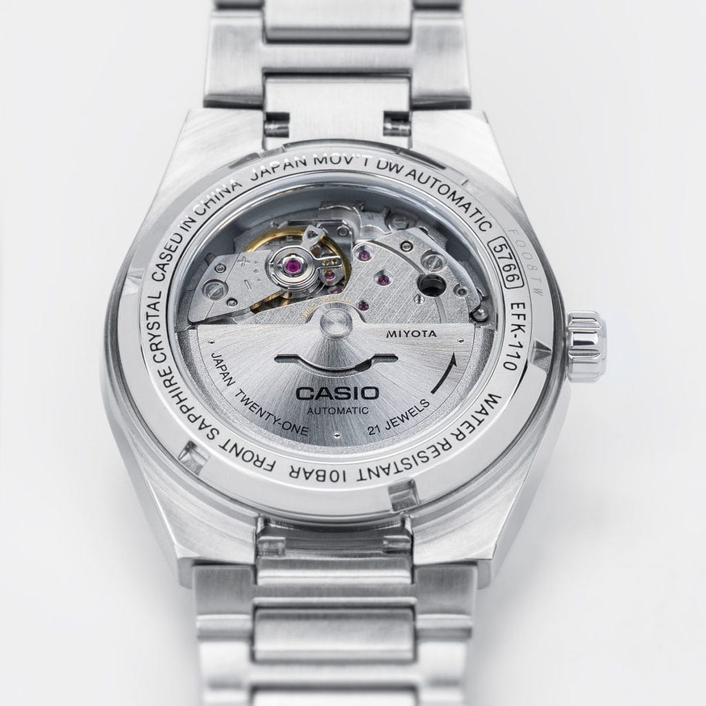 Ce qui doit d’abord être relevé, c’est le positionnement de cette EFK-110D. Il n’est pas cherché ici à impressionner par une complication ou par un discours technologique survitaminé. Une montre automatique simple, lisible et cohérente a été privilégiée. Le mouvement, fabriqué au Japon, est visible à travers le fond de boîte vissé et transparent. Une réserve de marche de 41 heures est annoncée, avec remontage automatique, remontage manuel, stop-seconde, 21 rubis et une fréquence de 21 600 alternances par heure. Pour une montre de ce niveau de prix, l’ensemble apparaît sérieux, proprement construit et parfaitement en phase avec une utilisation de tous les jours.