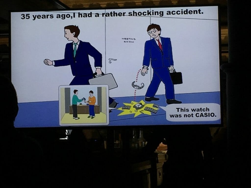 Parmi toutes ces innovations, l’une d’entre elles va devenir une icône, la DW-5000 C, plus connue du grand public sous l’appellation G-Shock. L’histoire veut qu’en 1981 Kikuo Ibe, ingénieur au service Recherche et Développement de Casio fait tomber la montre offerte par son père.