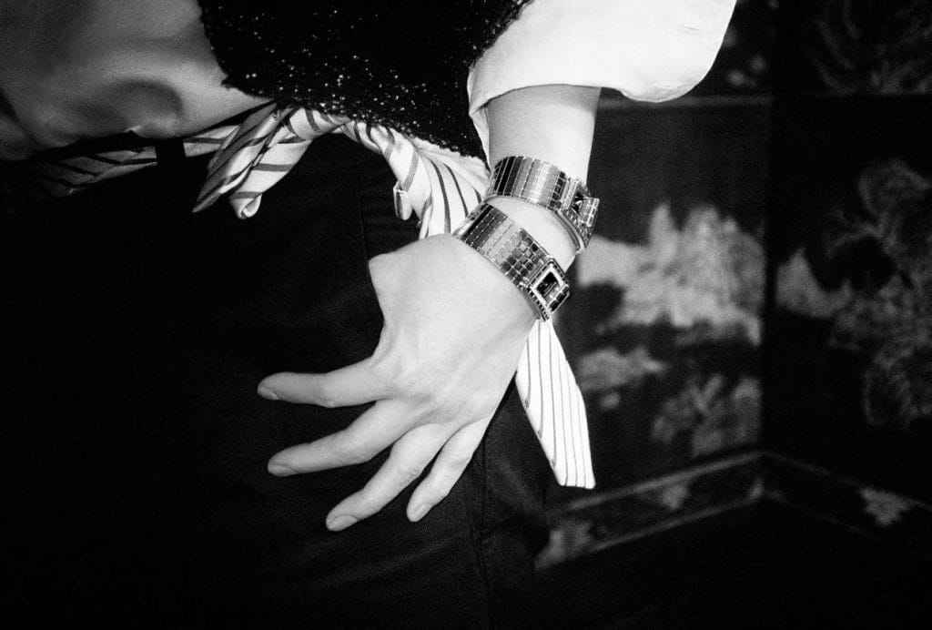 Au premier abord, un bracelet qui étincelle autour du poignet. C’est un bijou ! On reconnaît ensuite le fermoir du sac 2.55. Ce bijou est un code ! Puis, on distingue deux aiguilles. Ce code est une montre ! Le regard glisse enfin le long du bracelet matelassé. Cette montre est décodée !