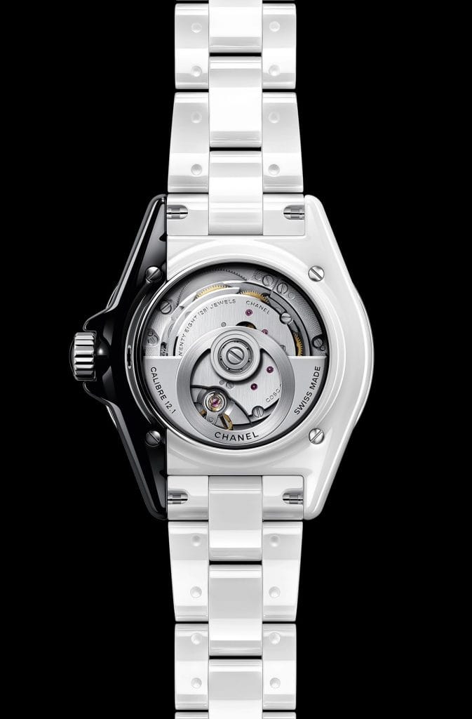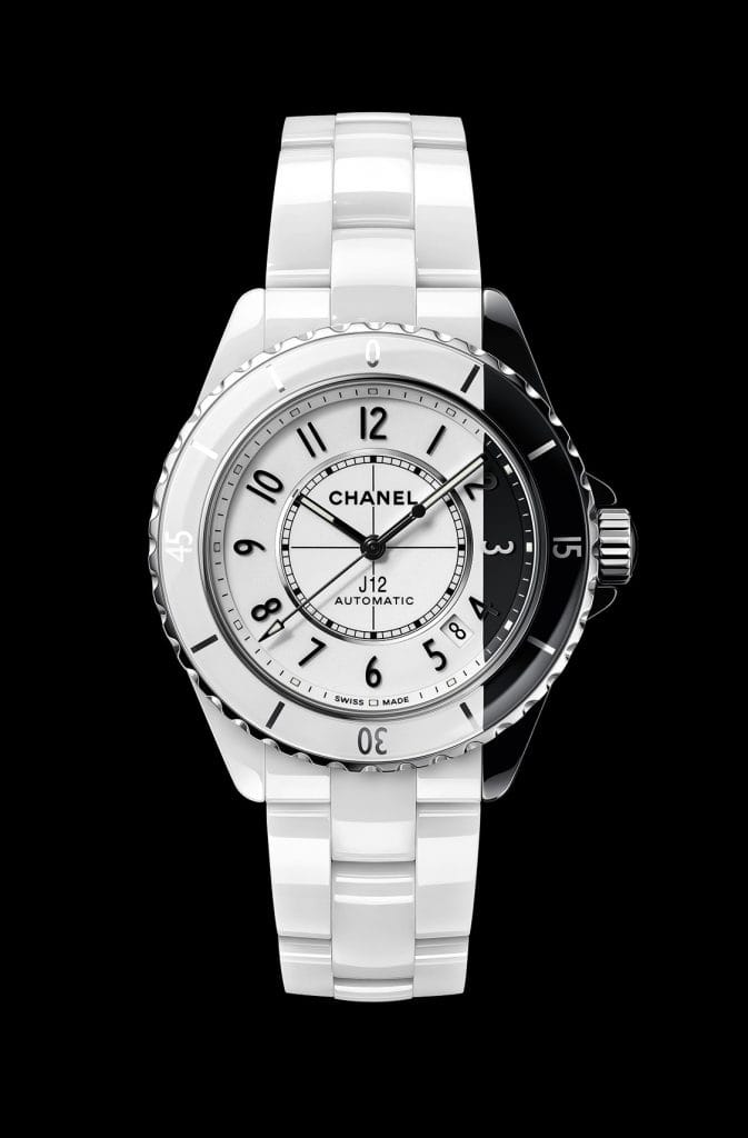 L’identité bicolore de la J12 Paradoxe se distingue complètement quand la montre est vue de face. Par anamorphose la démarcation entre le noir et le blanc est parfaite.