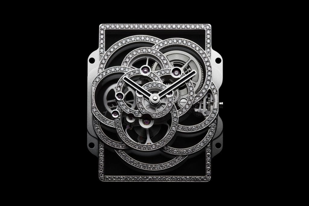 Cette pièce d’exception est animée par le deuxième mouvement maison de CHANEL, le Calibre 2, dont la géométrie aérienne dessine une fleur de camélia. La complexité de ce mouvement vient notamment de la disposition des différents mécanismes qui devaient être positionnés de façon à ne laisser visible que la fleur de camélia en trois dimensions. D’un noir absolu, ce mouvement squelette, unique en son genre incarne l’un des symboles iconiques de la Maison.