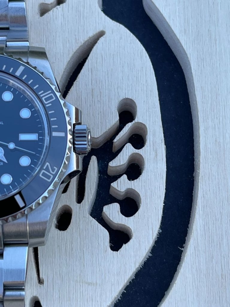 En juin dernier je vois qu’il publie des visages d’enfants réalisés par découpe de bois. Le résultat est édifiant. Je ne sais pas si c’est son métier que de travailler le bois, mais une idée me traverse l’esprit. Sur les groupes Facebook d’amateurs de montres, on peut voir de temps en temps quelques réalisations artistiques destinées aux passionnés d’horlogerie. J’ai alors l’idée de proposer quelque chose à Cédric. Je lui soumets le projet qu’il accepte de mener avec enthousiasme.