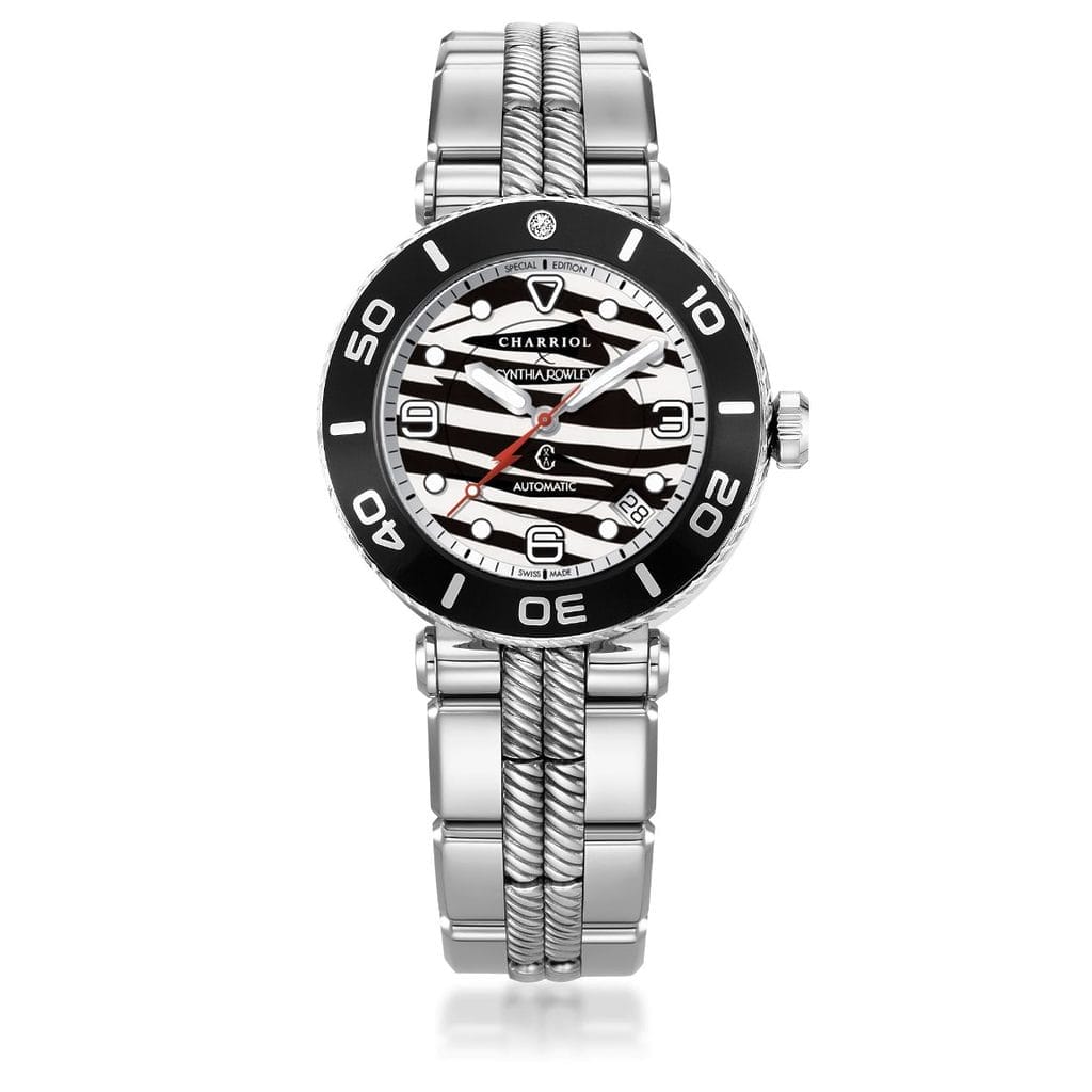 La montre de Surf Navigator – 36 mm, fabriquée en Suisse avec un mouvement automatique, a été conçue par Charriol pour le globe-trotter moderne au style de vie aventureux. La collection en édition spéciale Charriol X Cynthia Rowley est disponible en deux versions, avec deux imprimés différents : l’imprimé Shark Deterrent et un nouvel imprimé floral estival, montés sur le bracelet de plongée en caoutchouc noir de Charriol. Le cadran abrite une trotteuse en forme d’éclair, inspirée de la planche de surf préférée de Coralie. La montre est étanche jusqu’à 10 ATM.