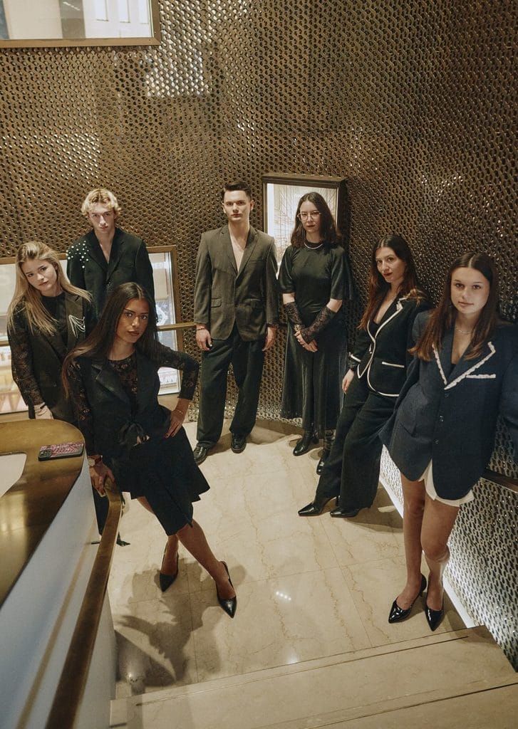 Dès l’entrée, le ton était donné. Les magnifiques suspensions en céramique installaient une atmosphère presque scénique, suspendue entre raffinement et solennité. Puis le regard se portait vers l’escalier monumental, devenu le véritable cœur battant de la présentation. C’est là que le défilé prenait naissance. C’est de là que surgissaient les silhouettes, dans une descente pensée comme un moment de révélation. Les créations des étudiantes apparaissaient alors avec une force particulière, portées par la verticalité du lieu, par sa théâtralité naturelle, par ce mélange rare de prestige architectural et de tension émotionnelle.