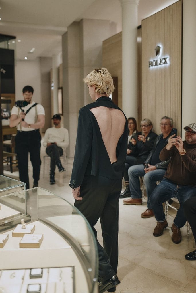 Les mannequins, eux aussi castés par les étudiantes, s’engageaient ensuite dans un parcours d’une grande intelligence visuelle. Ils avançaient devant un public manifestement séduit, jusqu’à l’entrée de la boutique, en contournant une polyzone où se côtoient des montres du CPO Bucherer et une œuvre panthère signée Steve Chaudanson. Dans ce dialogue entre création contemporaine, patrimoine horloger et mise en scène du désir, le défilé trouvait un relief supplémentaire. La mode n’était pas plaquée sur le lieu. Elle s’y inscrivait avec naturel, comme si elle révélait une autre lecture possible de cet univers de précision et d’exception.