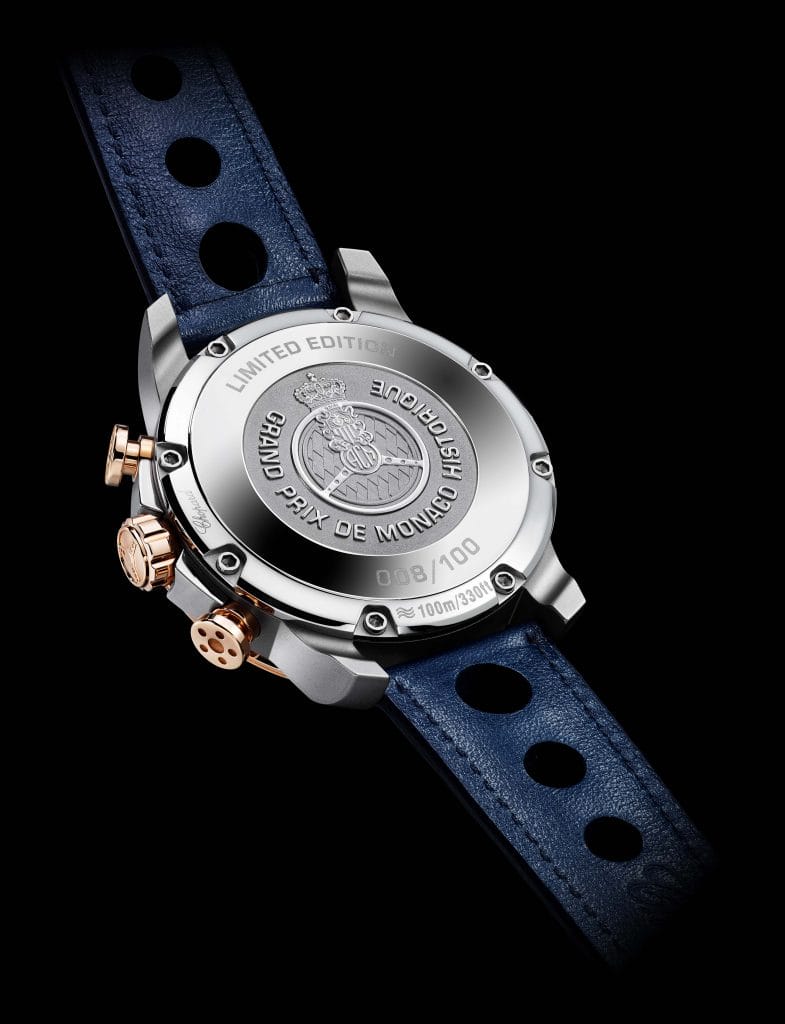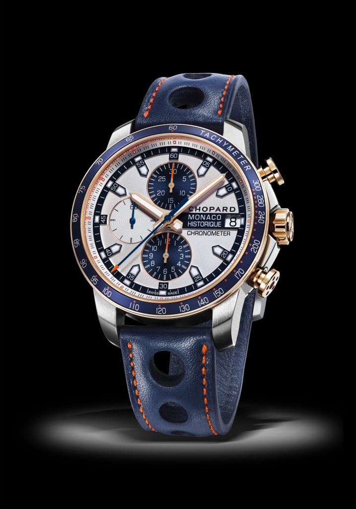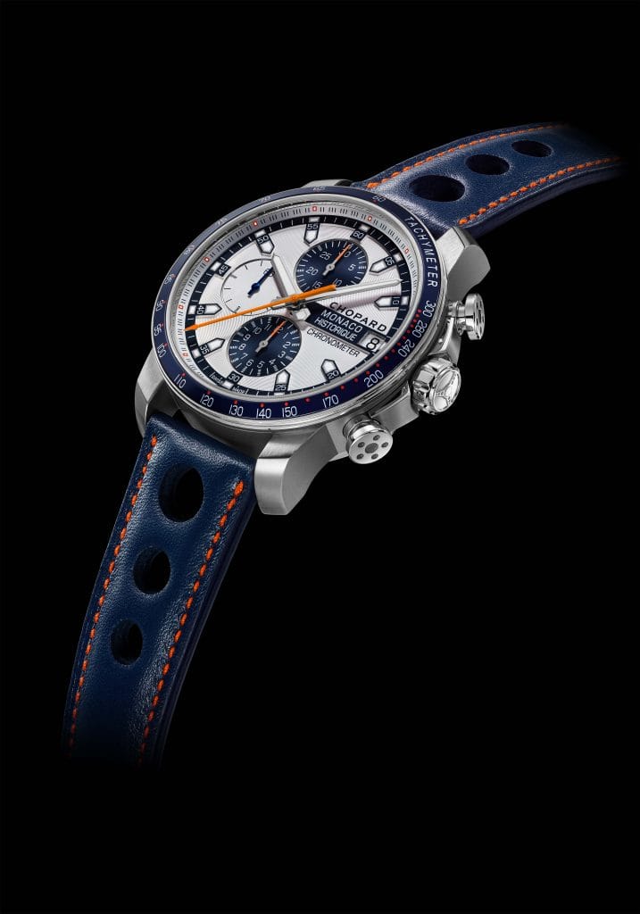 Surmonté de poussoirs en forme de pistons de moteur et d’une lunette bleue avec échelle tachymétrique, idéale pour calculer la vitesse moyenne en course, le boîtier de 44.5 mm de diamètre est muni d’une couronne vissée et d’un fond gravé du logo de l’Automobile Club de Monaco. Ce dernier est fixé avec des vis rappelant les boulons des voitures. Étanche à 100 mètres, il abrite un moteur horloger de haute précision, certifié chronomètre par le Contrôle Officiel Suisse des Chronomètres (COSC), qualité indispensable pour un chronographe Chopard. Ce mouvement mécanique à remontage automatique, pourvu d’une réserve de marche d’environ 46 heures, offre les fonctions heures, minutes, secondes, chronographe et date.