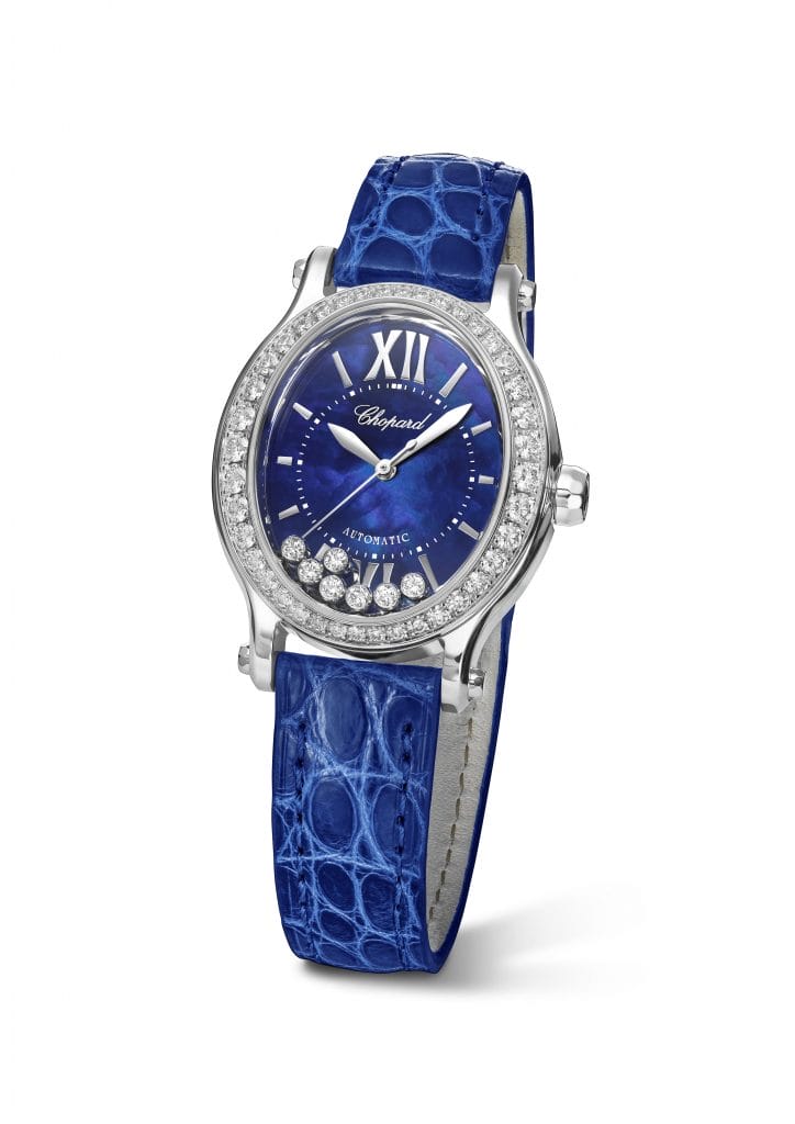 La Happy Sport se décline aujourd’hui dans deux versions joaillières inédites qui mettent habilement en scène un autre symbole d’éternité : les diamants. La première d’entre elles, avec un boitier et une lunette en or blanc 18ct entièrement sertis, est ornée d’un magnifique cadran en or blanc finement guilloché à la main et sur lequel sept diamants mobiles dansent leur ronde infinie. Un hommage animé à la virtuosité joaillière maitrisée par les artisans de la Maison Chopard. Cette Happy Sport, plus précieuse que jamais, est proposée sur un bracelet en cuir brillant bleu marine, un clin d’œil à une couleur indémodable, chérie par la Maison depuis ses origines. La seconde déclinaison, également en or blanc 18ct, renoue avec l’attachement de Chopard pour l’utilisation de la nacre perlée, un matériau naturel dont l’aspect cotonneux, doux et réconfortant à l’œil, invite à la contemplation. La majesté de ses teintes bleu roi – une couleur également reprise sur le bracelet en cuir brillant – est rehaussée par une étincelante lunette sertie de diamants. Ces deux nouveautés sont disponibles en exclusivité dans les boutiques Chopard et éditées en séries limitées de 25 pièces.
