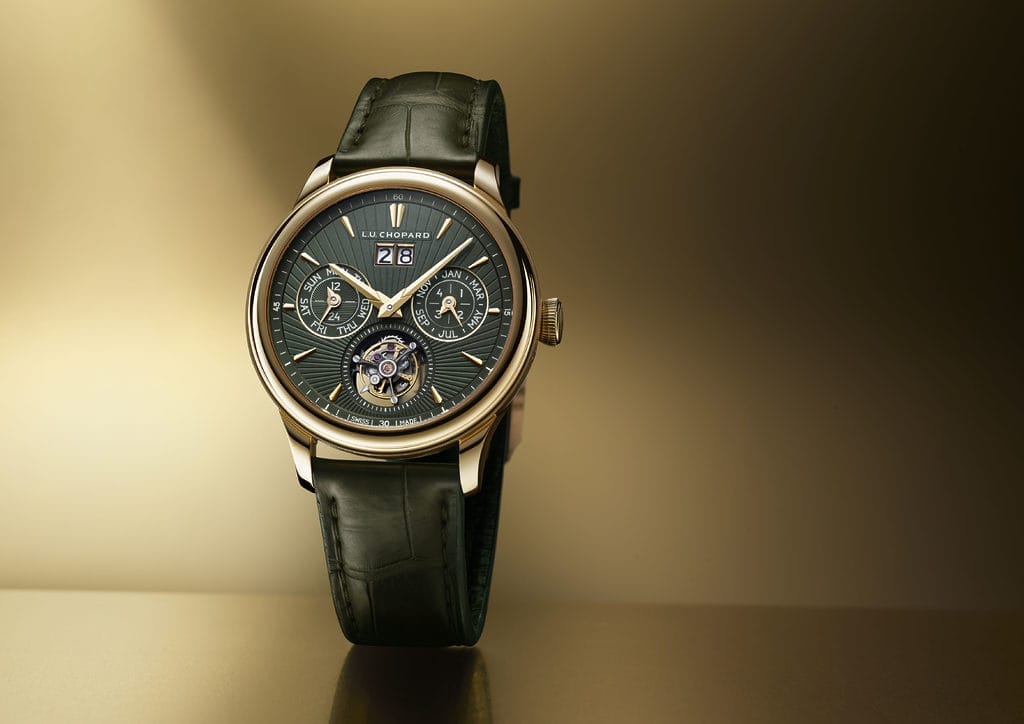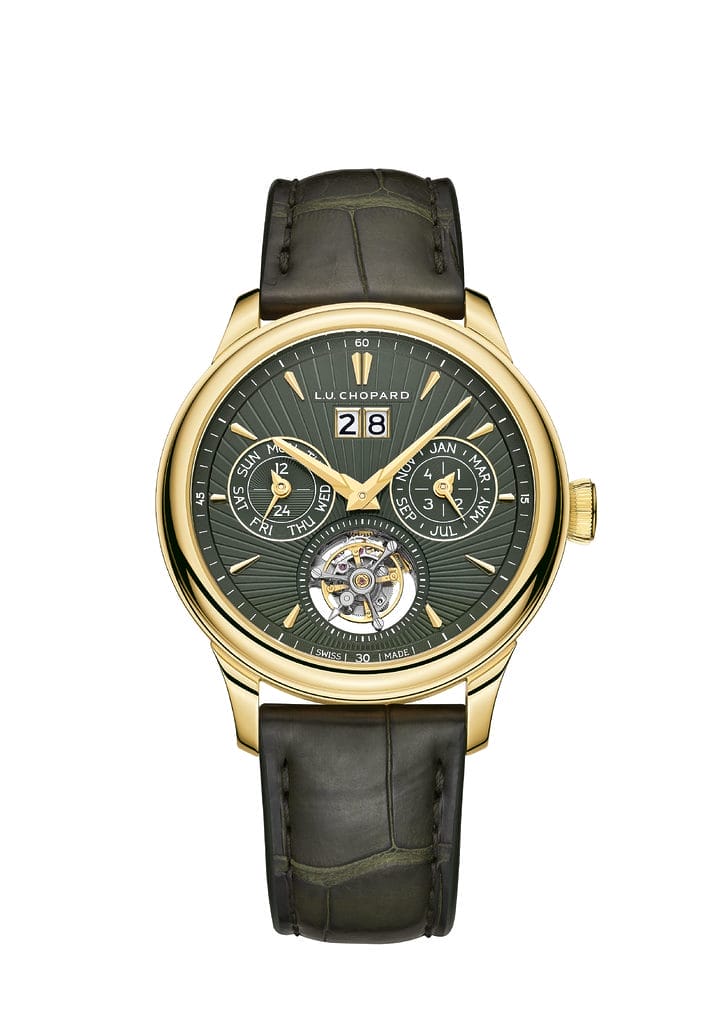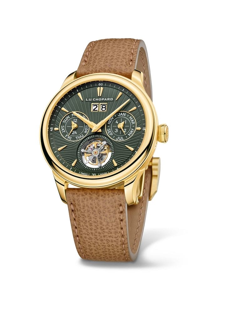 Le cadran guilloché à la main, d’un vert profond obtenu par traitement PVD, reflète l’héritage de la collection L.U.C. Son motif soleillé émane de l’ouverture du tourbillon volant à 6 heures, tandis que les compteurs azurés et les aiguilles en or jaune complètent un design raffiné et lisible.